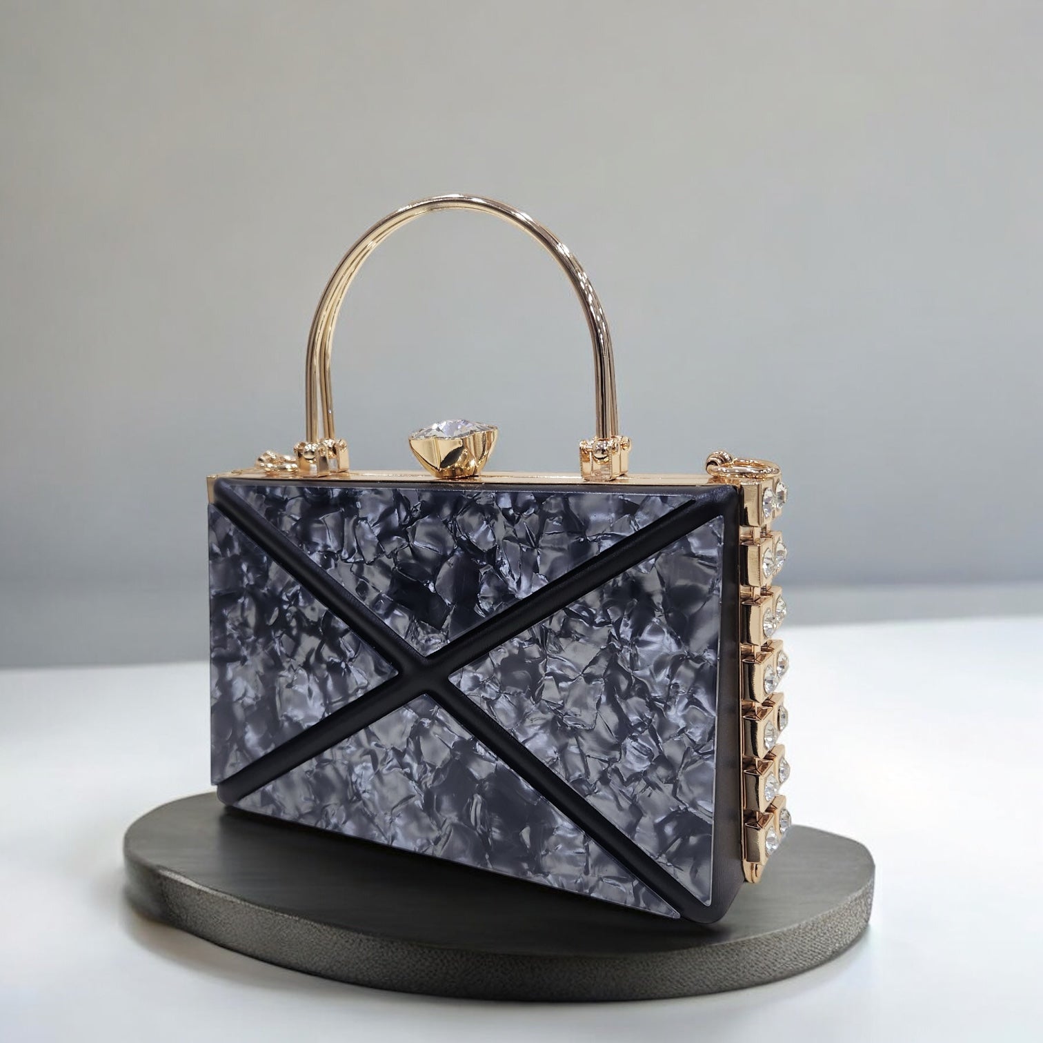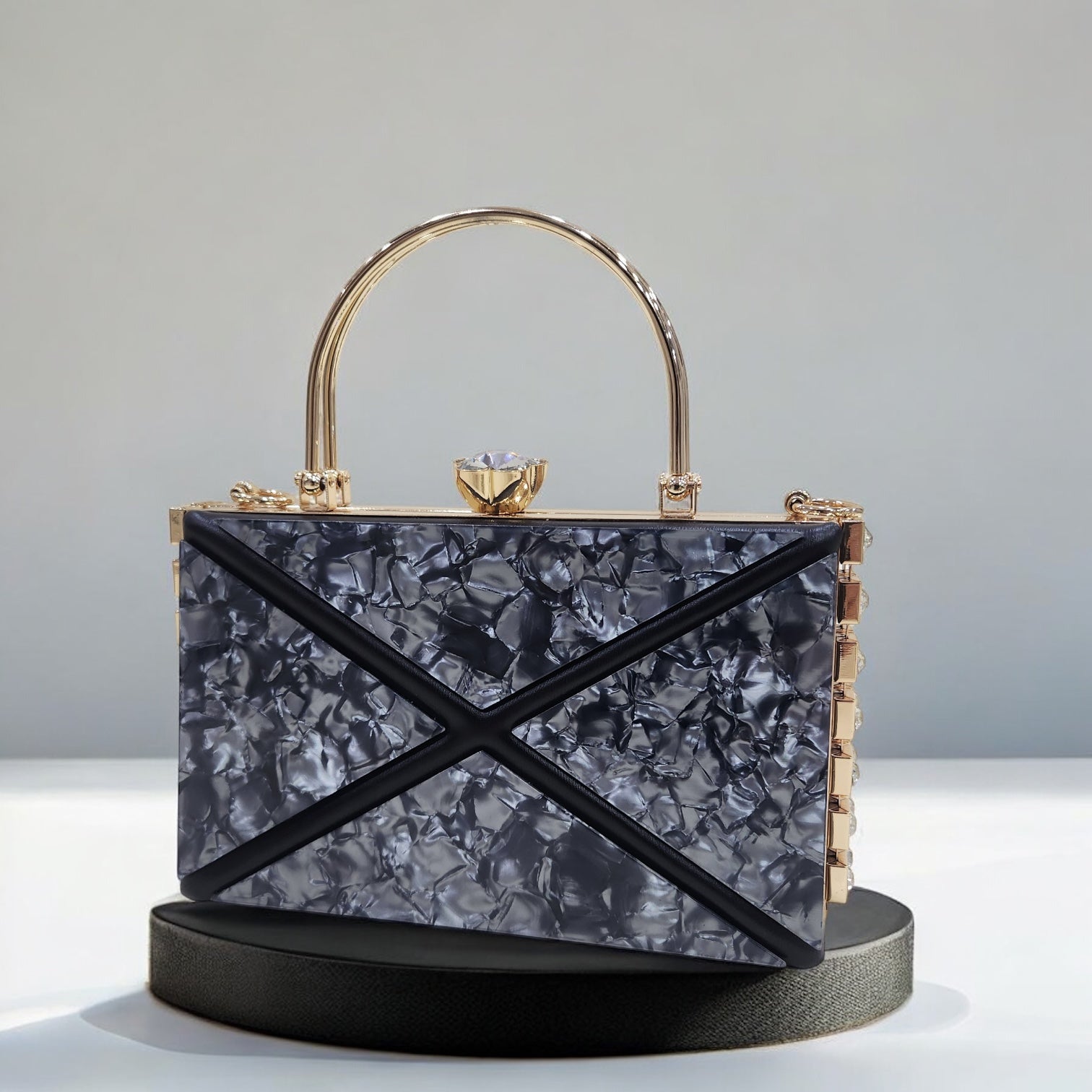 "Add a touch of grandeur to your ensemble with this rectangle double-wrist-handled frame box clutch. The front features a stunning marble-look finish, exuding modern sophistication, while the sides are adorned with seven oversized diamonds on each side for a dazzling effect. A statement-making large diamond knob closure enhances its luxurious appeal. The back is crafted from smooth PU leather, offering a sleek contrast. This versatile clutch also includes a detachable shoulder chain, allowing you to carry it as a wristlet or wear it elegantly over the shoulder. Perfect for elevating your style at any occasion."