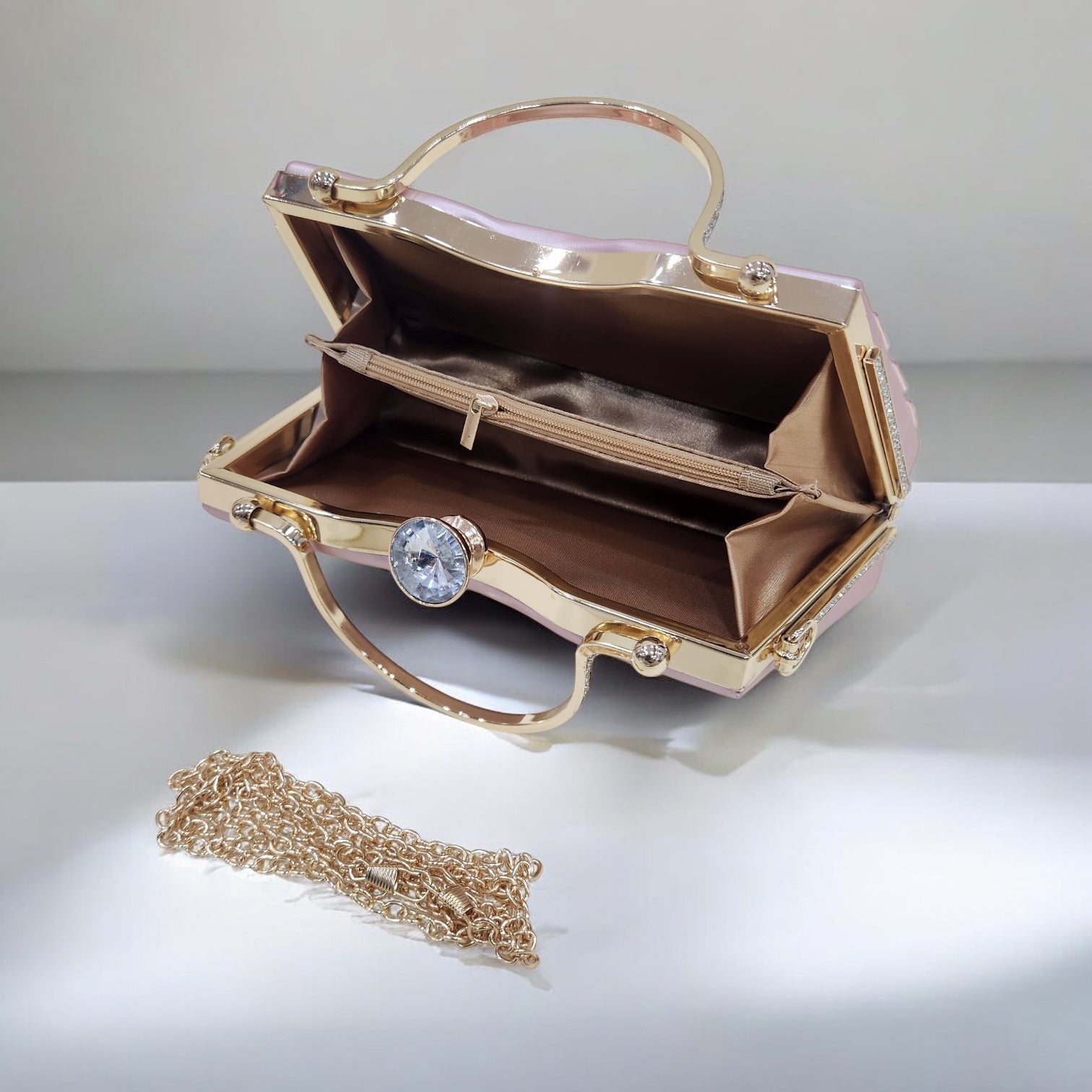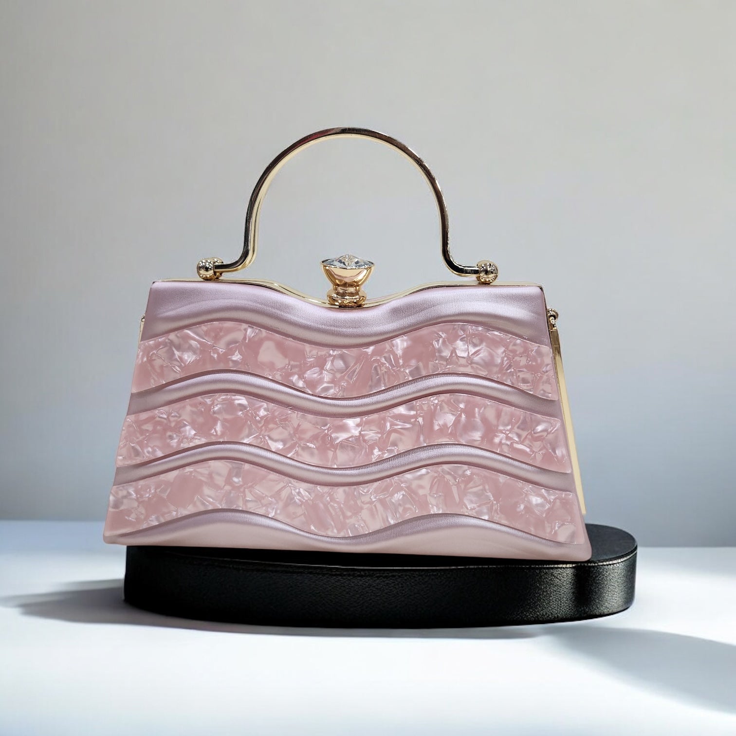 "Elevate your accessory game with this trapezium-shaped double-wrist-handled frame box clutch. The front showcases a mesmerizing marble-look wave design, exuding contemporary elegance, while the sides are adorned with delicate, glimmering diamonds for a subtle yet sophisticated sparkle. A bold diamond knob closure adds a luxurious touch, complementing the plain PU leather back for a sleek finish. Complete with a detachable shoulder chain, this clutch offers versatility, allowing you to carry it as a wristlet or wear it stylishly over the shoulder. A perfect blend of modern charm and timeless sophistication for any occasion."