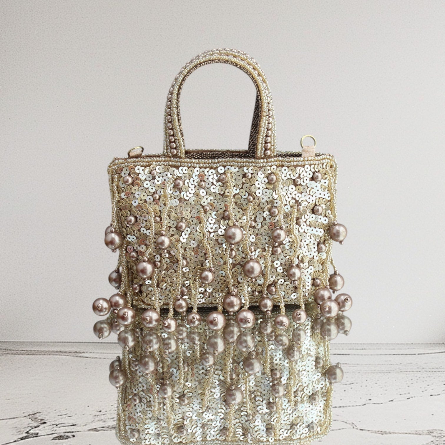 Add a touch of sparkle with this palm-sized mini bag, fully embroidered with shimmering sequins on both sides. The playful tassels — crafted with randomly placed seed beads and finished with pearls — bring a delicate yet stylish flair. Designed with a secure zip closure and a sleek sling chain, this lightweight bag is perfect for hands-free elegance at weddings, parties, and festive events. Compact yet statement-worthy, it's your go-to accessory for effortless glam and modern charm.