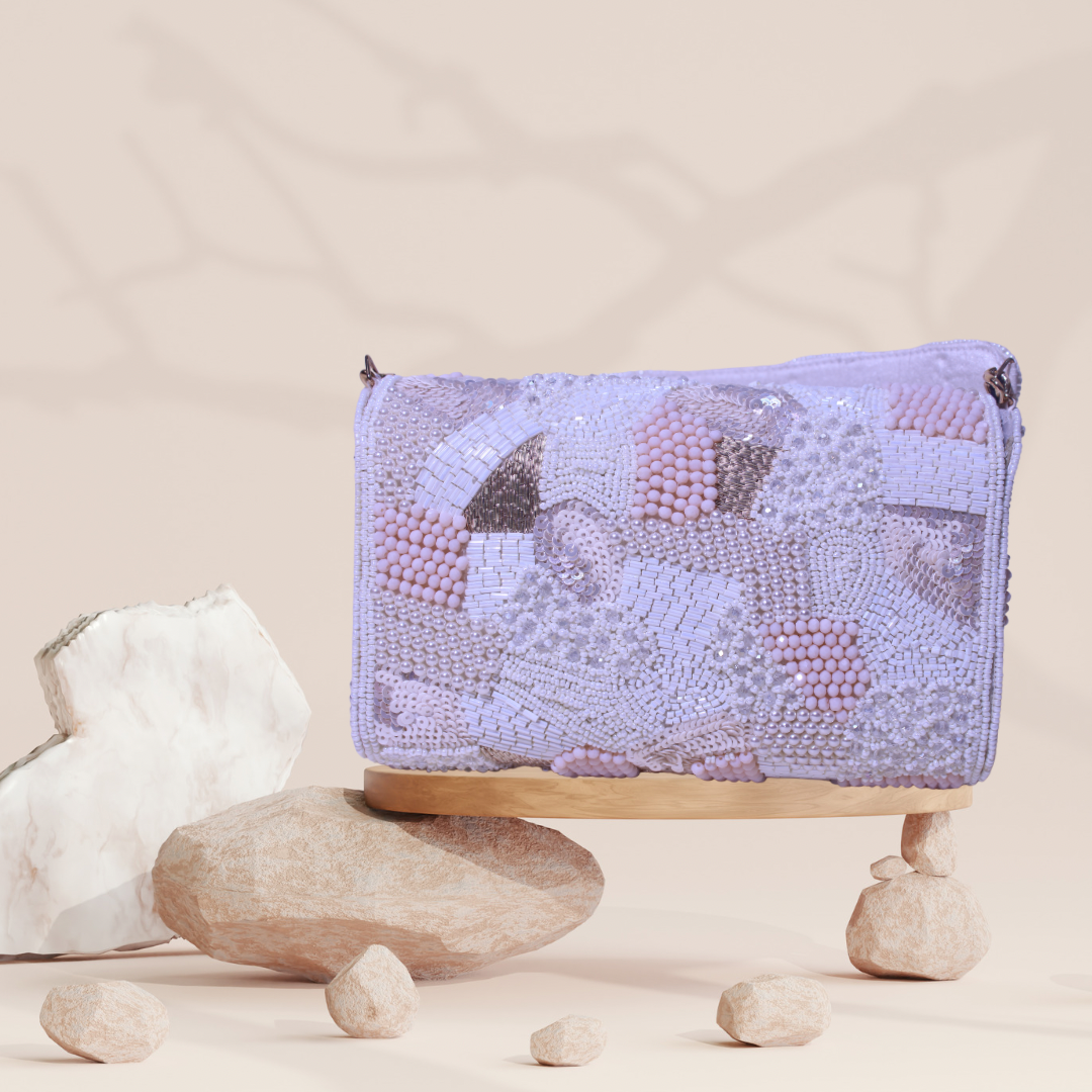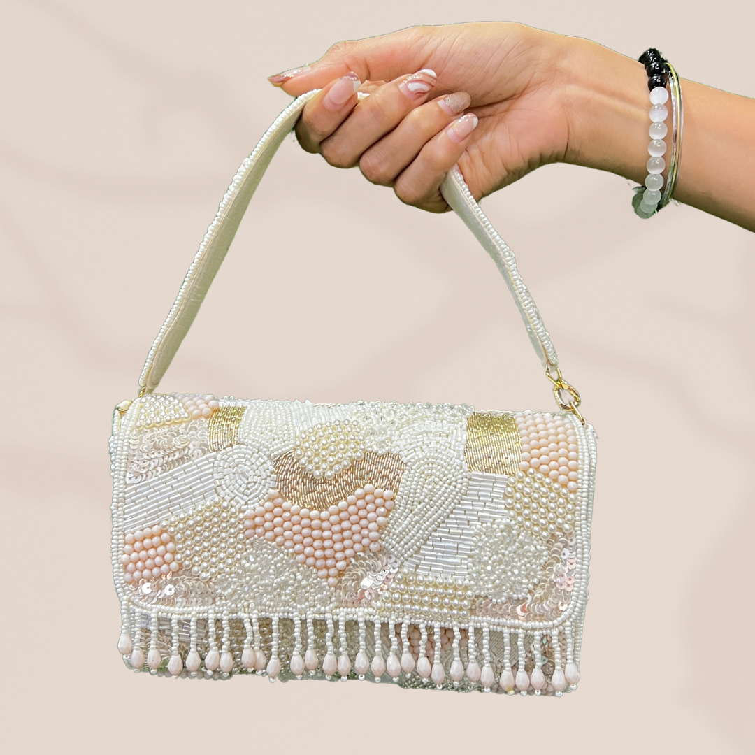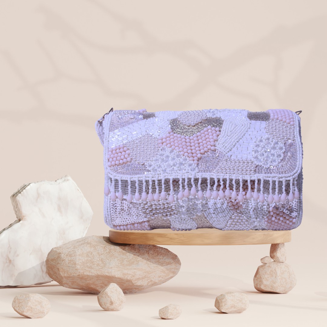 Elevate your ensemble with the Mosaic Symphony FlapOver Clutch Bag, a masterpiece of intricate hand embroidery. This stunning FlapOver Clutch Bag features a mosaic of pony beads, sequins, kora, seed beads, cut dana, and crystals, meticulously arranged to create a symphony of textures and colors. Crafted on premium raw silk, the bag exudes luxury and sophistication. The wrist belt, adorned with the same exquisite handwork, adds a cohesive and stylish touch to your look.