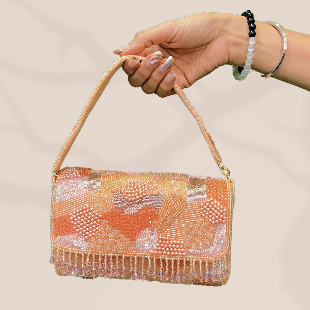 Elevate your ensemble with the Mosaic Symphony FlapOver Clutch Bag, a masterpiece of intricate hand embroidery. This stunning FlapOver Clutch Bag features a mosaic of pony beads, sequins, kora, seed beads, cut dana, and crystals, meticulously arranged to create a symphony of textures and colors. Crafted on premium raw silk, the bag exudes luxury and sophistication. The wrist belt, adorned with the same exquisite handwork, adds a cohesive and stylish touch to your look.