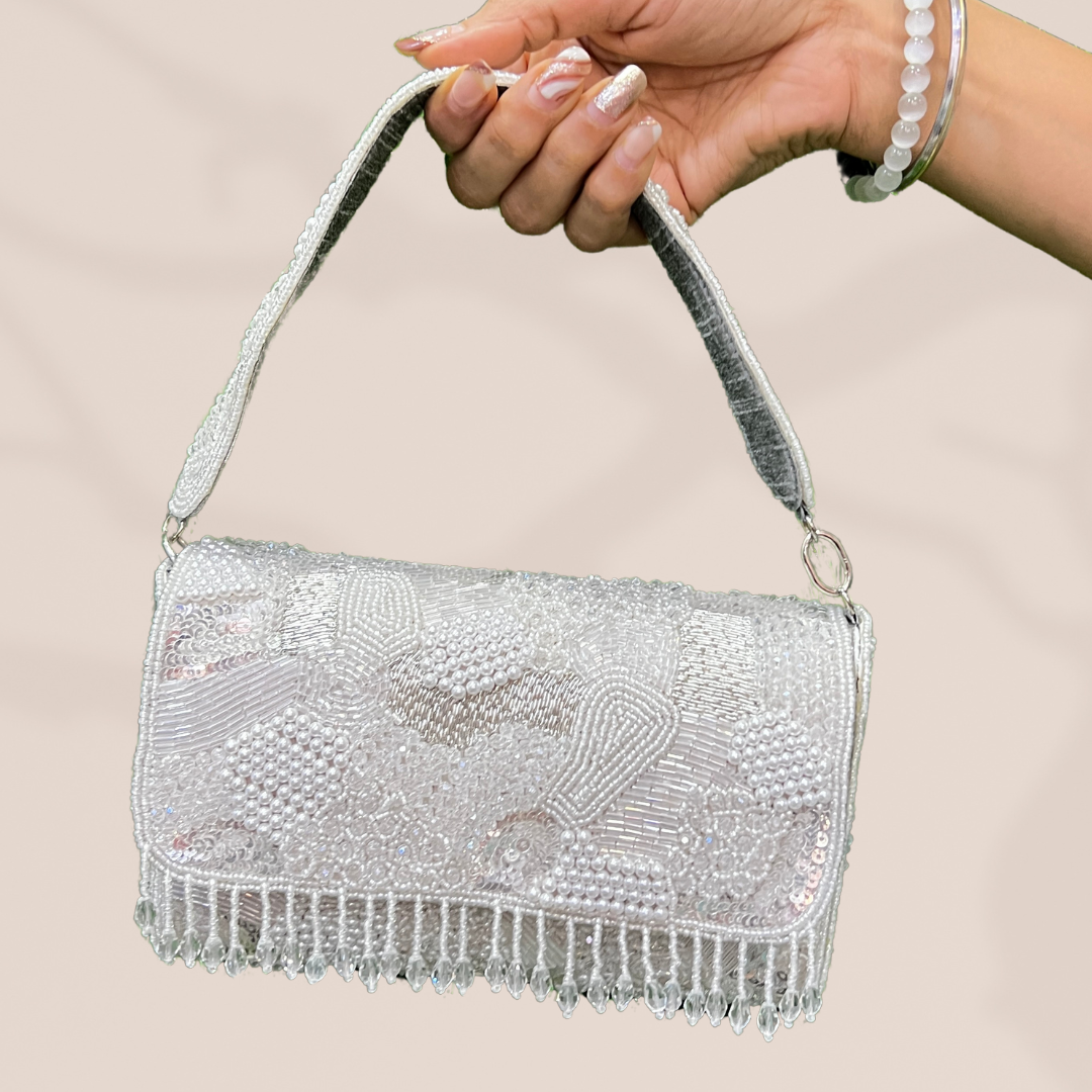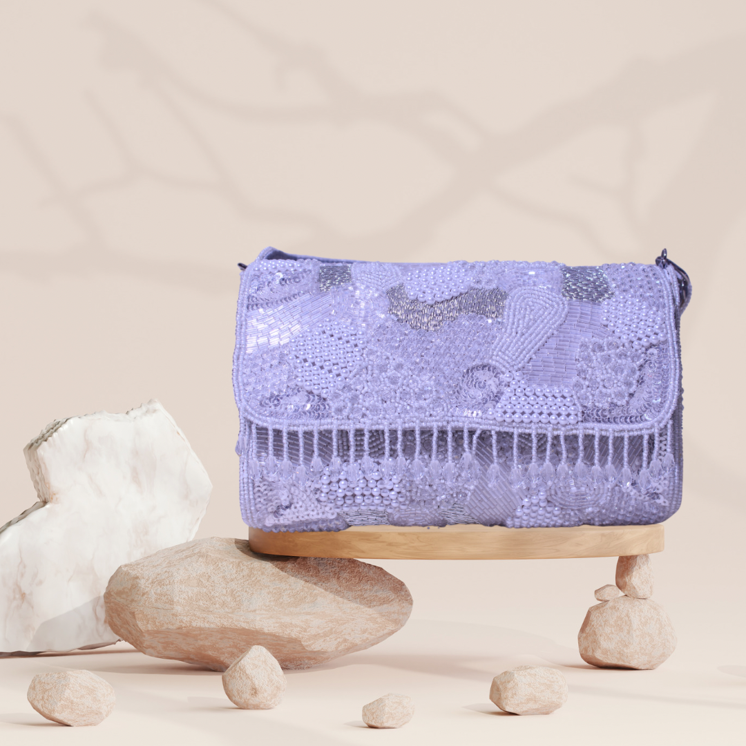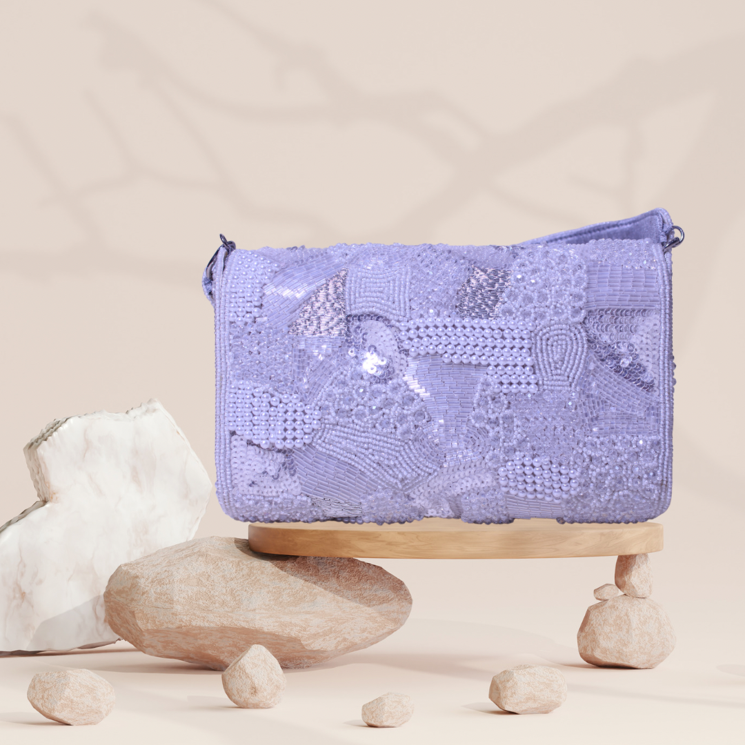 Elevate your ensemble with the Mosaic Symphony FlapOver Clutch Bag, a masterpiece of intricate hand embroidery. This stunning FlapOver Clutch Bag features a mosaic of pony beads, sequins, kora, seed beads, cut dana, and crystals, meticulously arranged to create a symphony of textures and colors. Crafted on premium raw silk, the bag exudes luxury and sophistication. The wrist belt, adorned with the same exquisite handwork, adds a cohesive and stylish touch to your look.