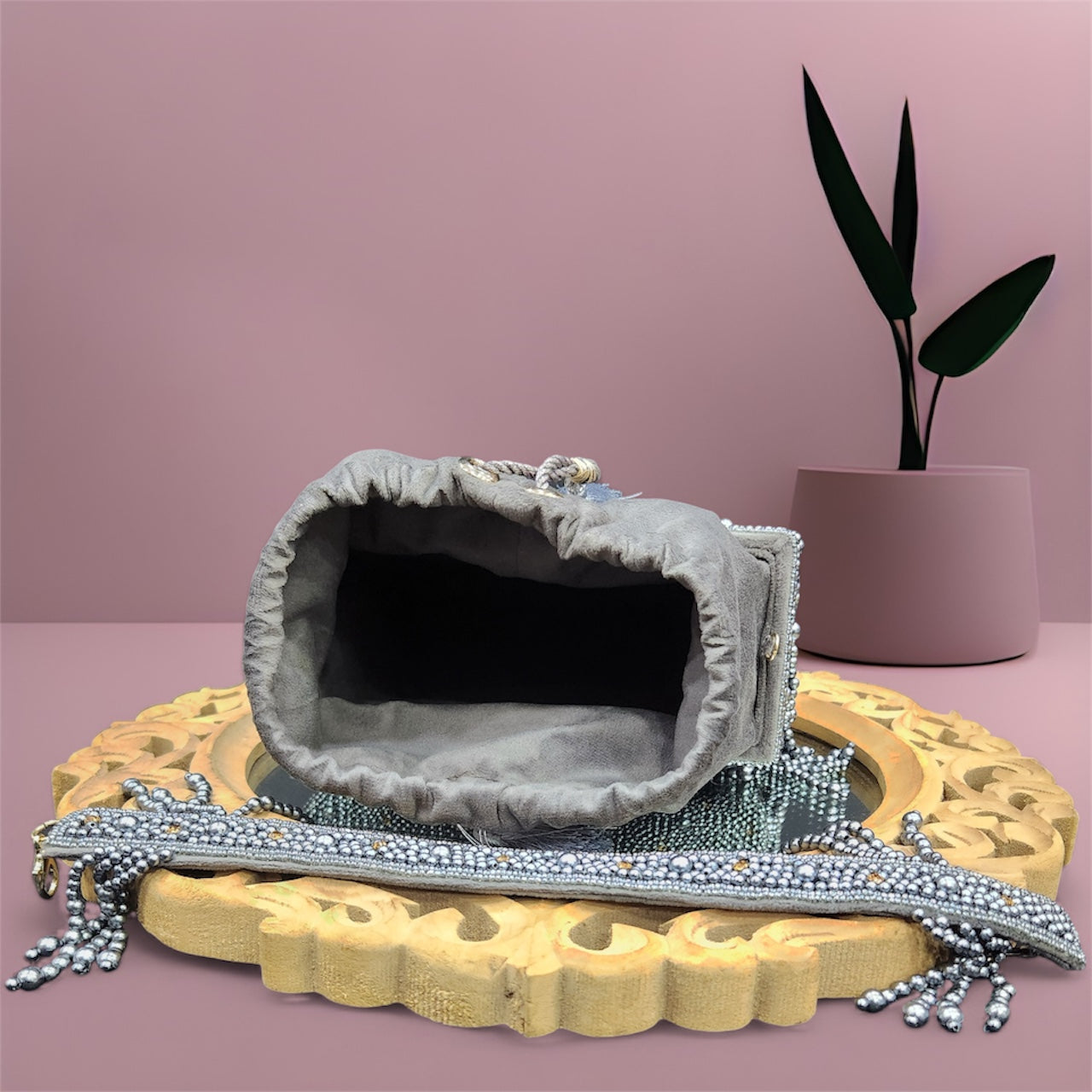Moti Dhara Potli Bag – A statement piece of elegance and tradition. This rectangular bucket bag features intricate pearl embroidery, a luxe potli insert with a drawstring closure, and exquisite pearl tassel hangings. The embroidered wrist handle, adorned with delicate tassels, adds a sophisticated touch. Perfect for weddings, festive celebrations, and evening soirées.