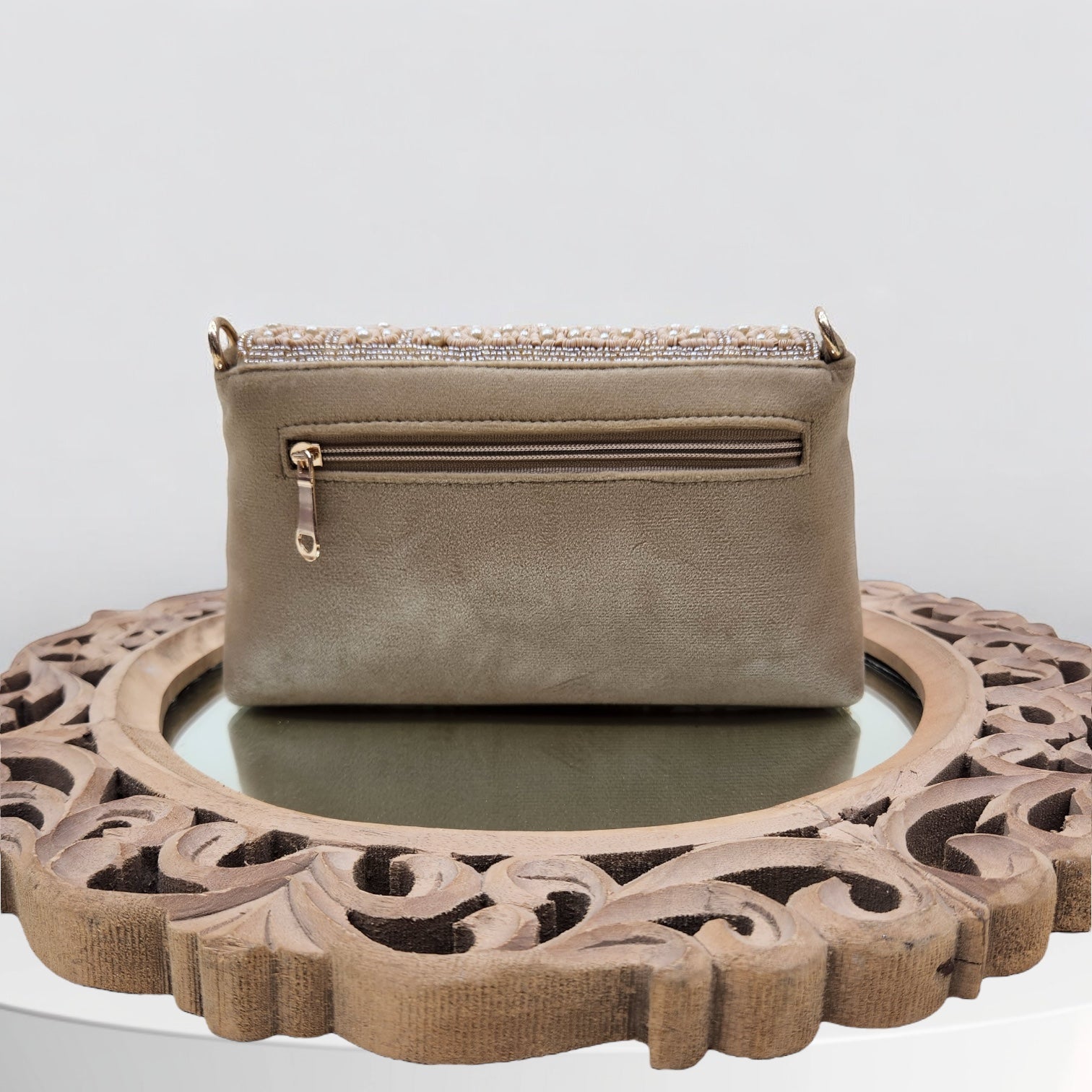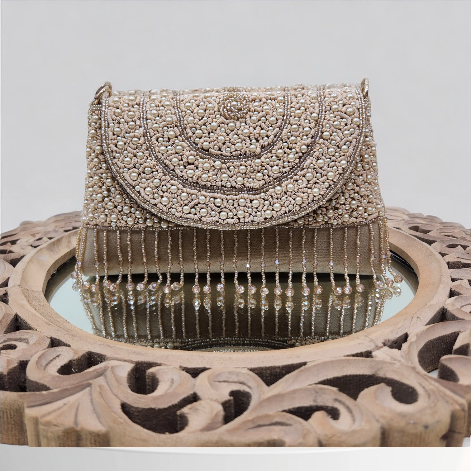 Add sparkle to your celebrations with Naaz, a luxurious hand-embroidered clutch crafted on plush velvet. Adorned with sequins, seed beads, and pearls, its intricate detailing, flapover silhouette, tassel fringe, and detachable pearl handle make it the perfect companion for bridal wear, festive occasions, and ethnic ensembles. Available in vibrant and pastel shades to match every mood.