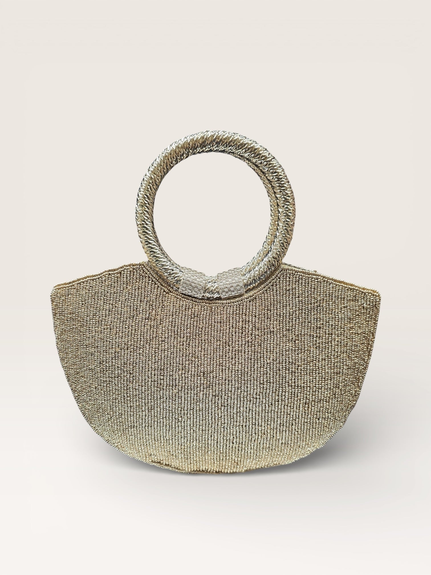 The focal point is the elegant Kada-style bangle handle, wrapped in metallic cord for a regal, easy-to-carry finish. While the front dazzles with intricate patterns, the back is meticulously finished with a full seed bead embroidery for a premium, snag-free feel.