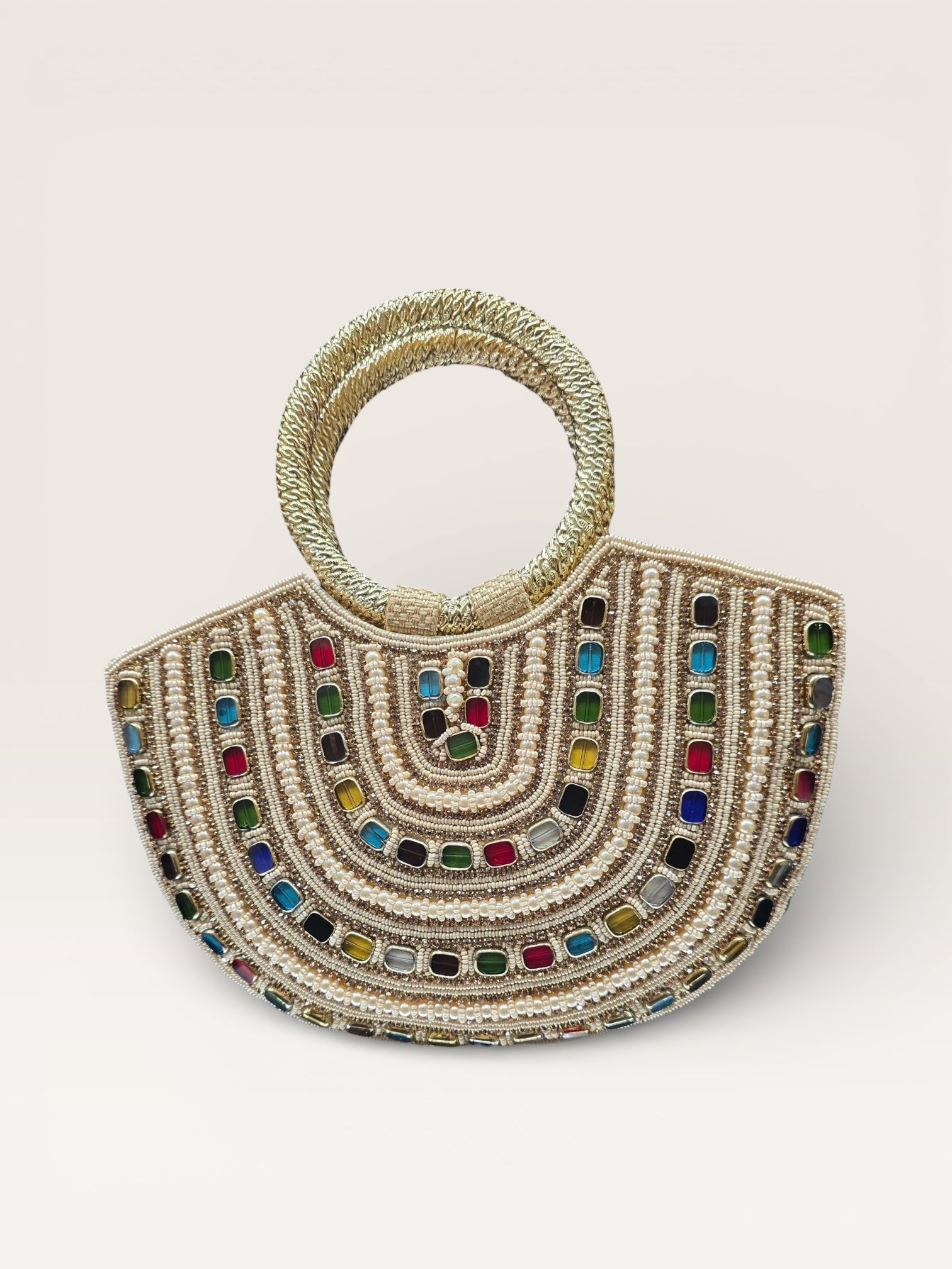 Make a statement with this stunning, hand-embroidered masterpiece. Merging boho-luxe aesthetics with artisanal precision, this crescent bag features a vibrant display of colorful stones, faux pearls, and shimmering diamonds set against a sustainable natural jute base.