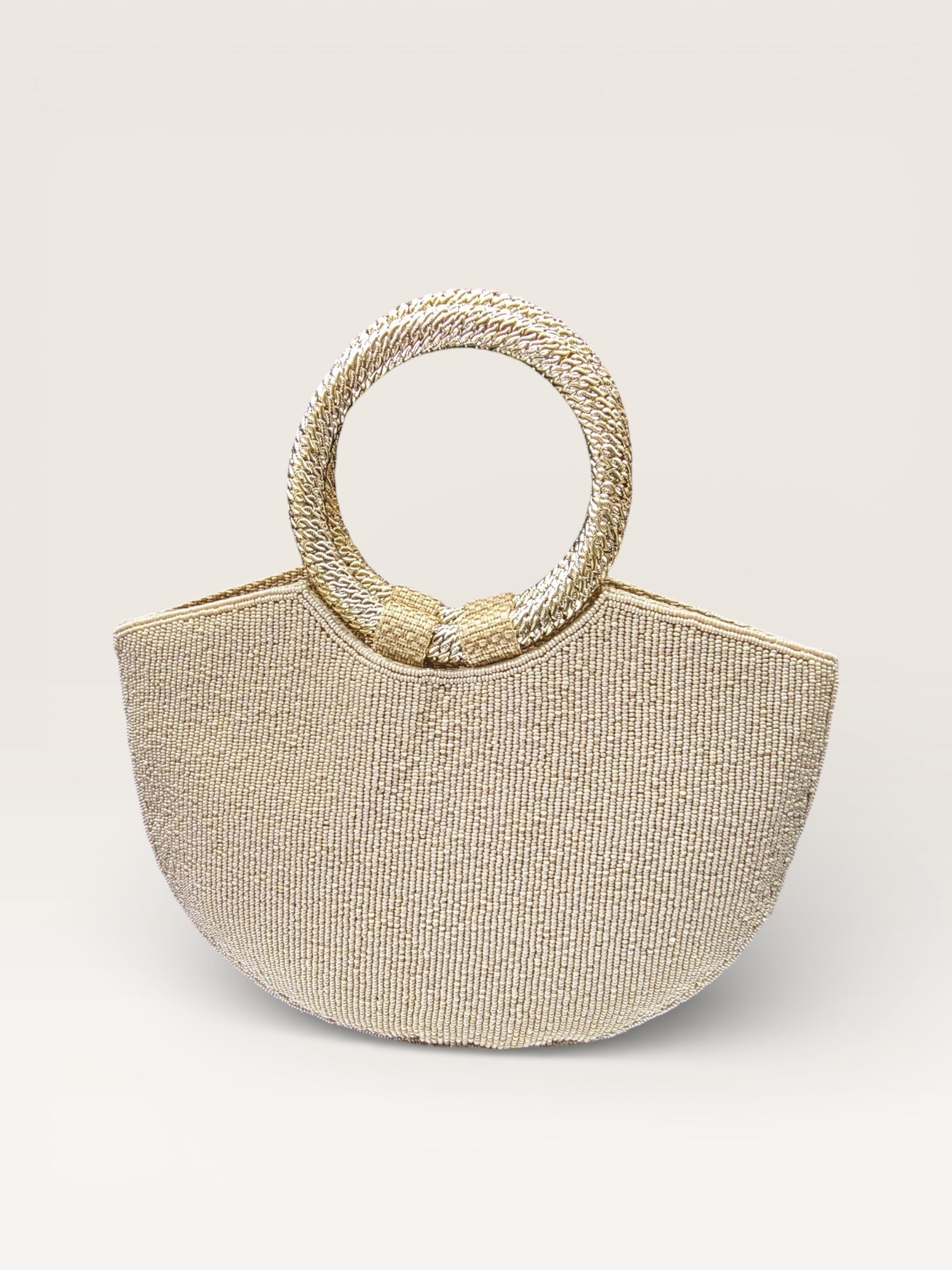 The focal point is the elegant Kada-style bangle handle, wrapped in metallic cord for a regal, easy-to-carry finish. While the front dazzles with intricate patterns, the back is meticulously finished with a full seed bead embroidery for a premium, snag-free feel.