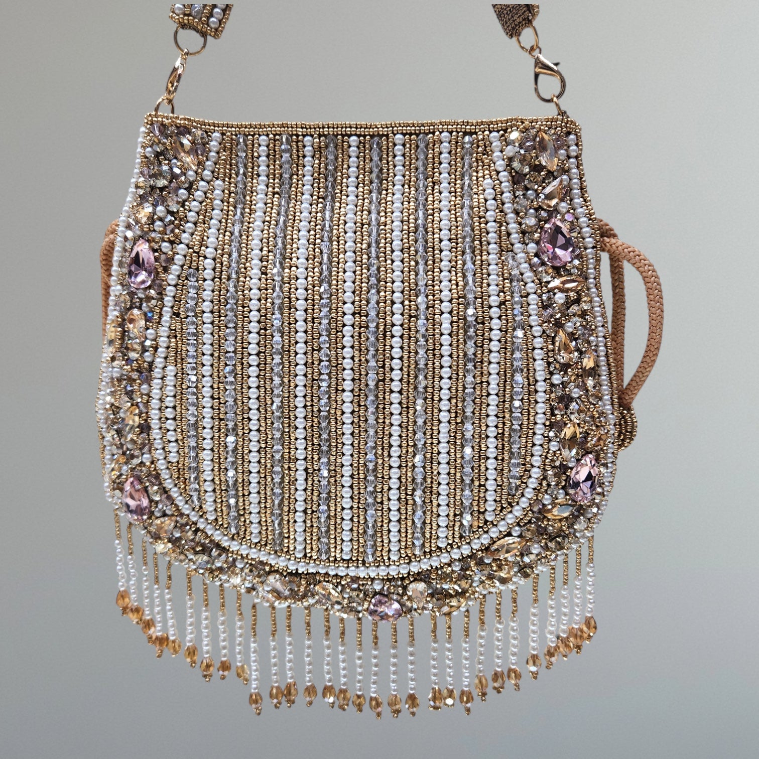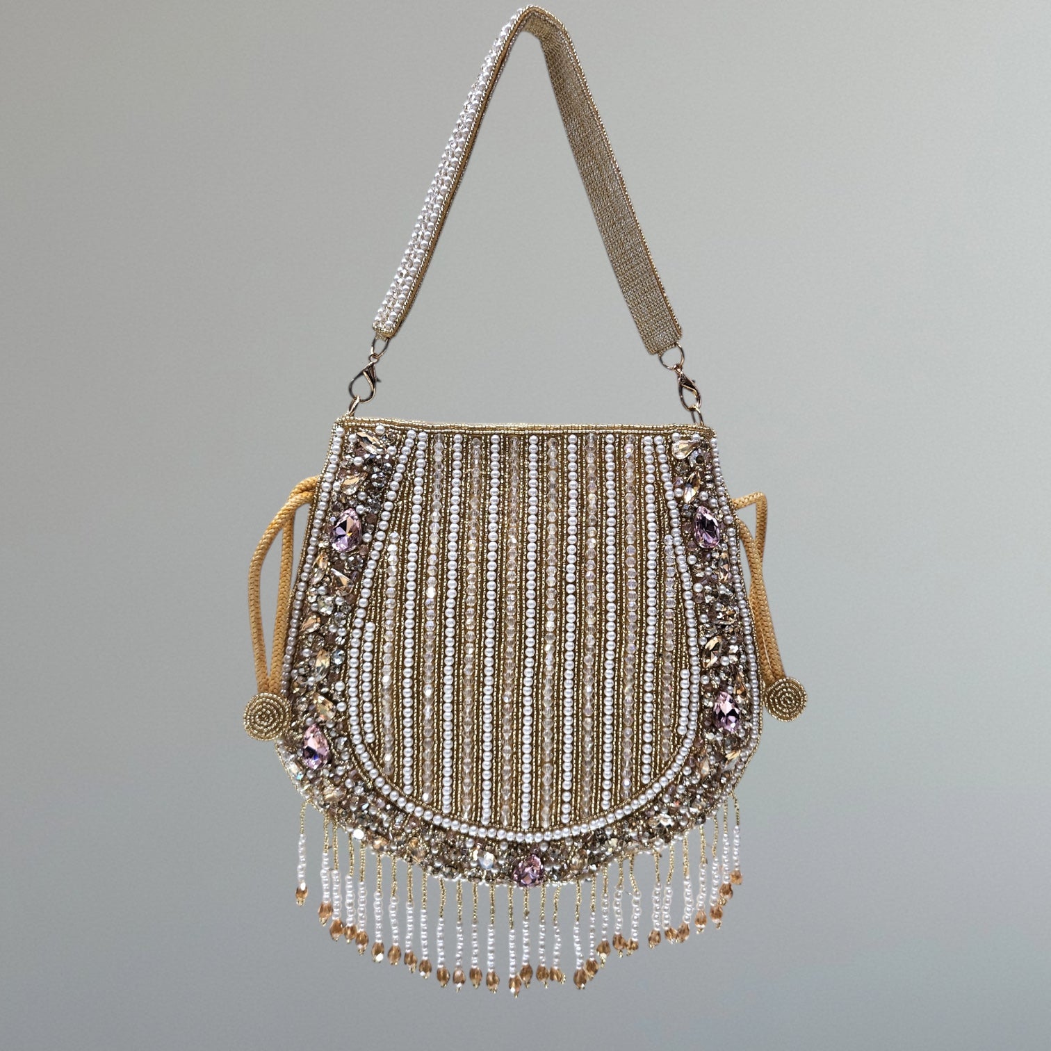 Elevate your ethnic ensemble with this stunning hand-embroidered potli bag, exquisitely adorned with shimmering seed beads, sparkling rhinestones, and intricate sequin work. The delicate fringe tassels add graceful movement, while the structured silhouette offers a blend of tradition and elegance. Thoughtfully designed with a soft inner lining, this potli features a magnetic flap closure that offers both convenience and style. It also includes a beautifully embellished handle for easy carrying. Perfectly sized to hold your essentials, this versatile accessory pairs effortlessly with lehengas, sarees, or gowns—making it an ideal choice for weddings, festive celebrations, and evening soirées.