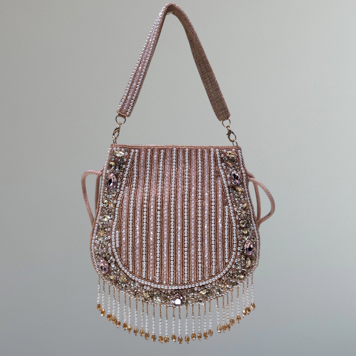 Elevate your ethnic ensemble with this stunning hand-embroidered potli bag, exquisitely adorned with shimmering seed beads, sparkling rhinestones, and intricate sequin work. The delicate fringe tassels add graceful movement, while the structured silhouette offers a blend of tradition and elegance. Thoughtfully designed with a soft inner lining, this potli features a magnetic flap closure that offers both convenience and style. It also includes a beautifully embellished handle for easy carrying. Perfectly sized to hold your essentials, this versatile accessory pairs effortlessly with lehengas, sarees, or gowns—making it an ideal choice for weddings, festive celebrations, and evening soirées.