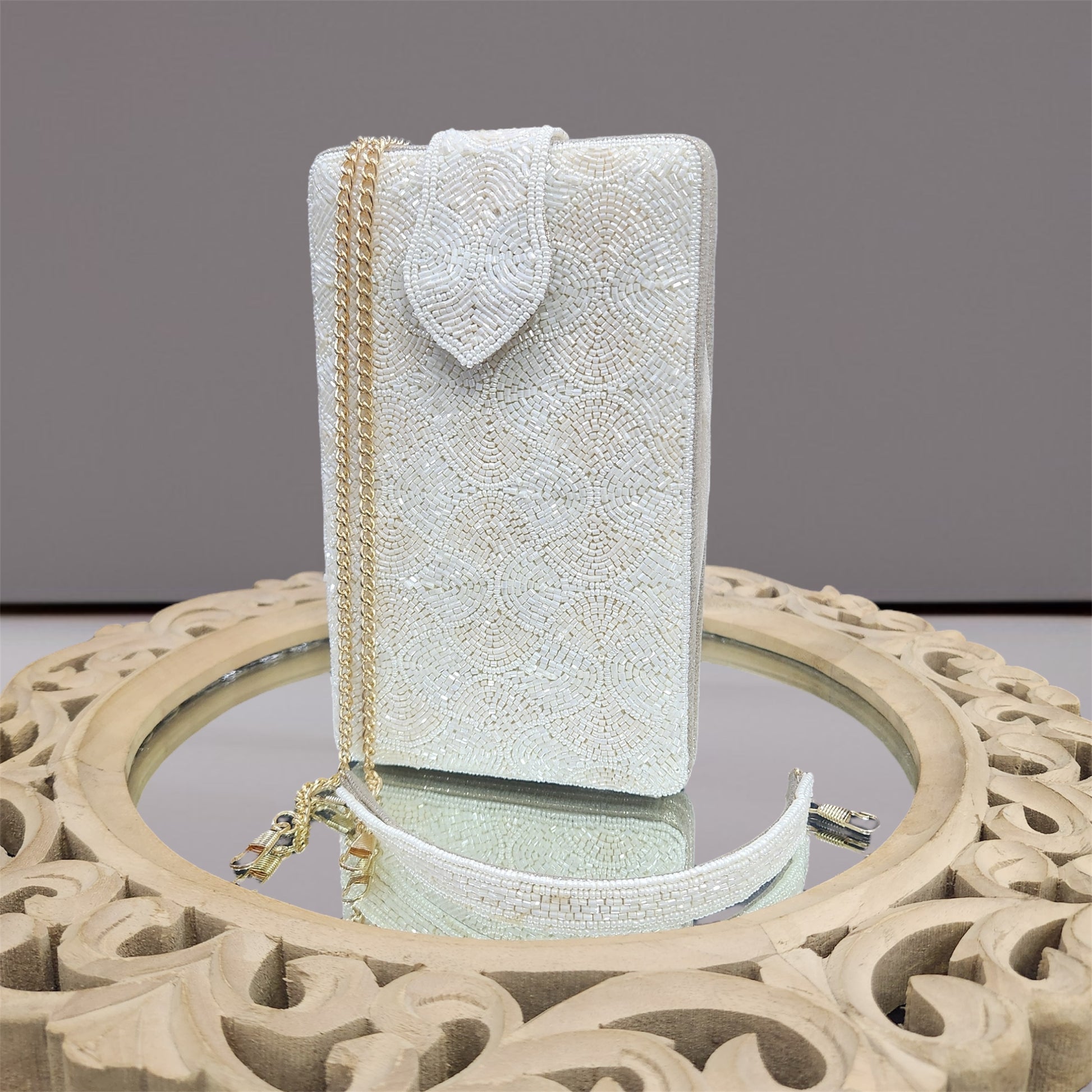 "Elevate your style with this exquisite box clutch, designed to make a lasting impression. Featuring intricate kardana hand embroidery in elegant semi-circular patterns across the surface, this clutch is a true work of art. The small flap with a magnetic closure ensures convenience and security, while the hand-embroidered short wrist handle adds a touch of sophistication. Complete with a sturdy and stylish thick sling chain, this clutch effortlessly blends functionality with glamour, making it perfect for weddings, parties, and special occasions."