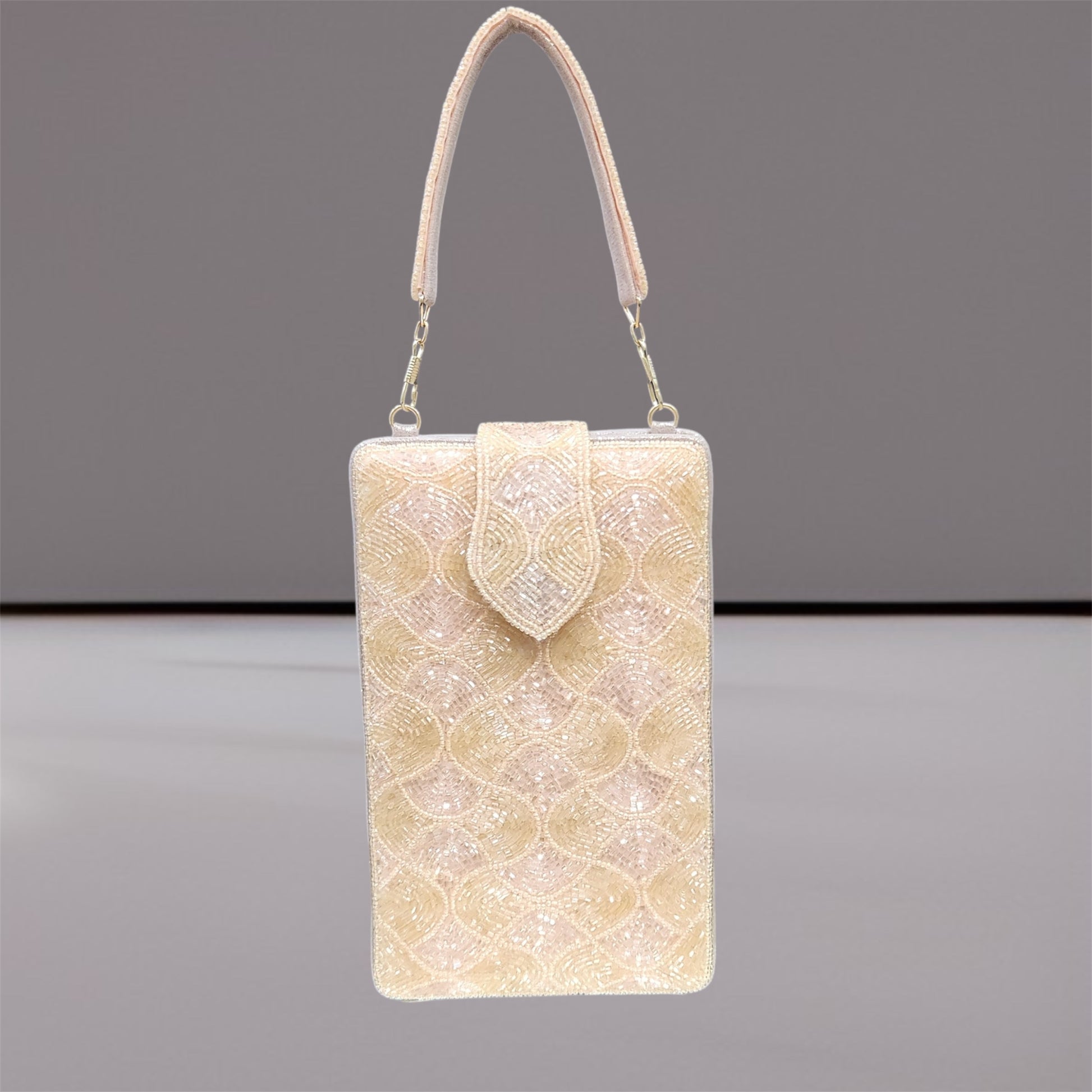 "Elevate your style with this exquisite box clutch, designed to make a lasting impression. Featuring intricate kardana hand embroidery in elegant semi-circular patterns across the surface, this clutch is a true work of art. The small flap with a magnetic closure ensures convenience and security, while the hand-embroidered short wrist handle adds a touch of sophistication. Complete with a sturdy and stylish thick sling chain, this clutch effortlessly blends functionality with glamour, making it perfect for weddings, parties, and special occasions."
