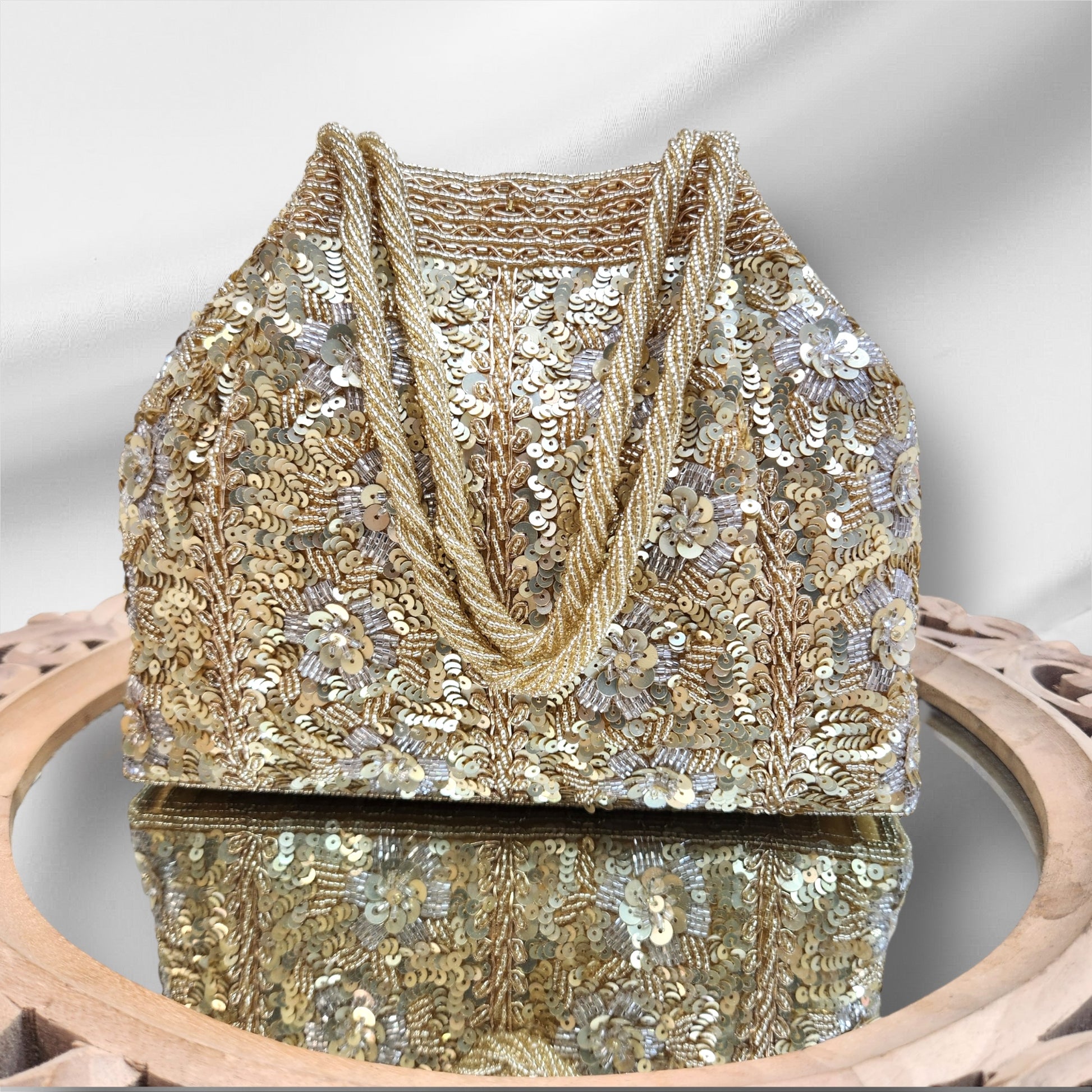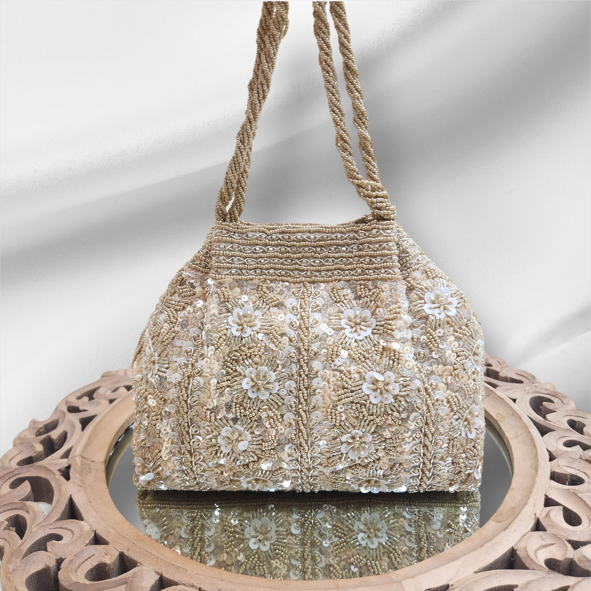 Exquisitely hand-embroidered with seed beads, sequins, and delicate floral motifs, this statement potli is a celebration of timeless Indian craftsmanship. Its structured silhouette, braided handle, and rich texture make it a perfect pick for weddings, sangeet nights, and festive occasions. Spacious yet elegant, it effortlessly complements both ethnic and fusion looks.