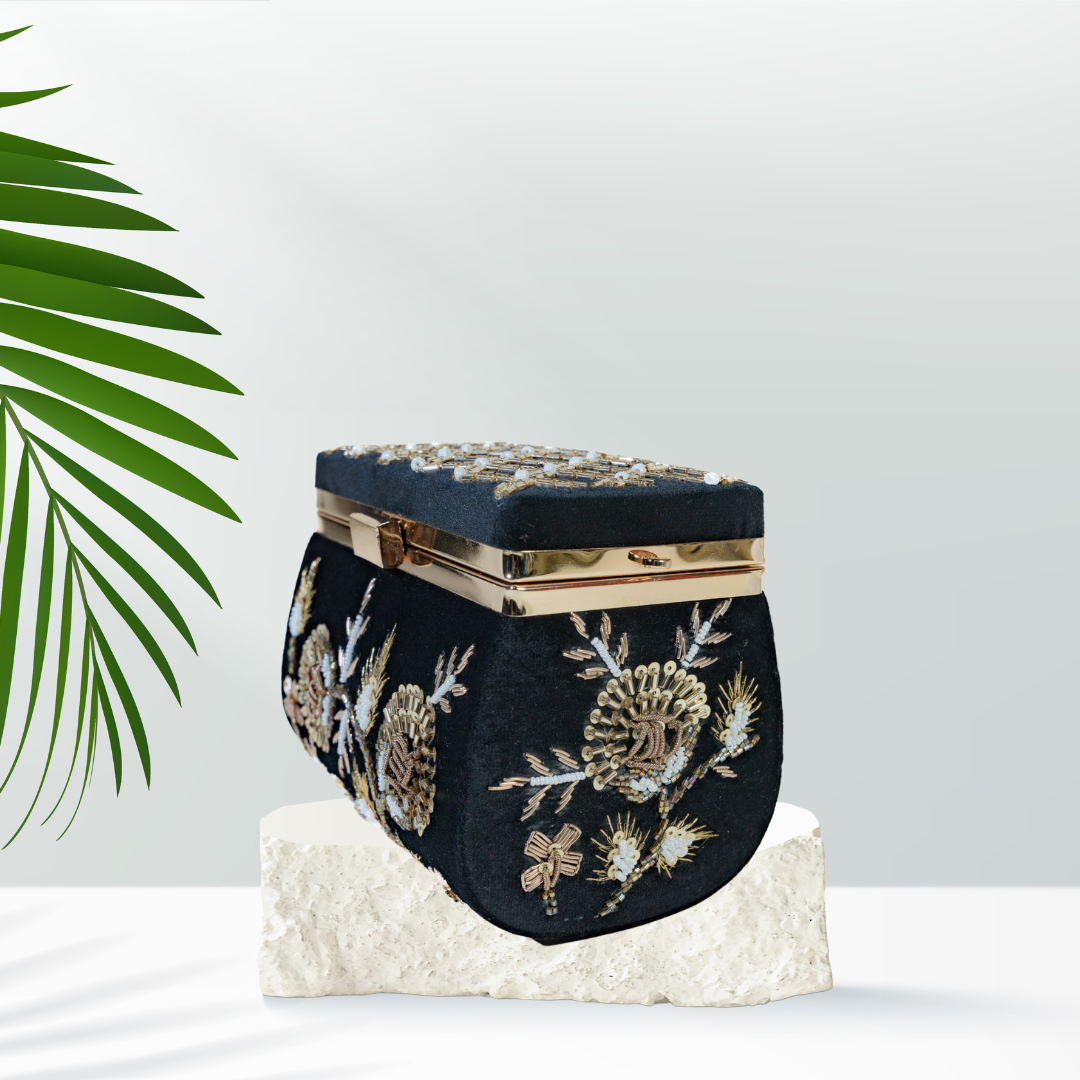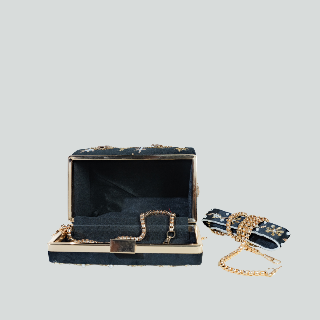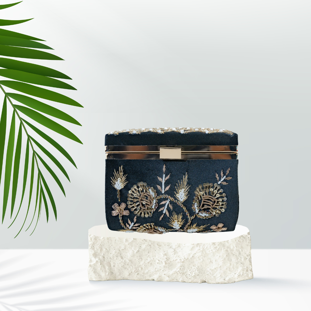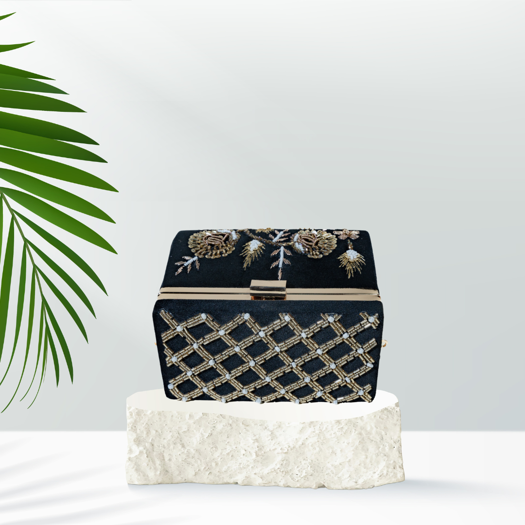 "Introducing the Heritage Matka Box Clutch, an exquisite blend of traditional craftsmanship and contemporary elegance. This stunning clutch features intricate jardozi handwork, beautifully embellished with white seed beads and kar dana on the front and sides. The top showcases a chic-chec pattern, skillfully crafted with pony beads, seed beads, and kar dana, adding a touch of sophistication. Each element is meticulously hand-embroidered, reflecting the rich heritage and artistry of traditional Indian craftsmanship. The compact yet spacious interior is perfect for carrying your essentials, making it ideal for special occasions or festive events. Elevate your ensemble with the Heritage Matka Box Clutch, a timeless accessory that embodies elegance and cultural heritage."