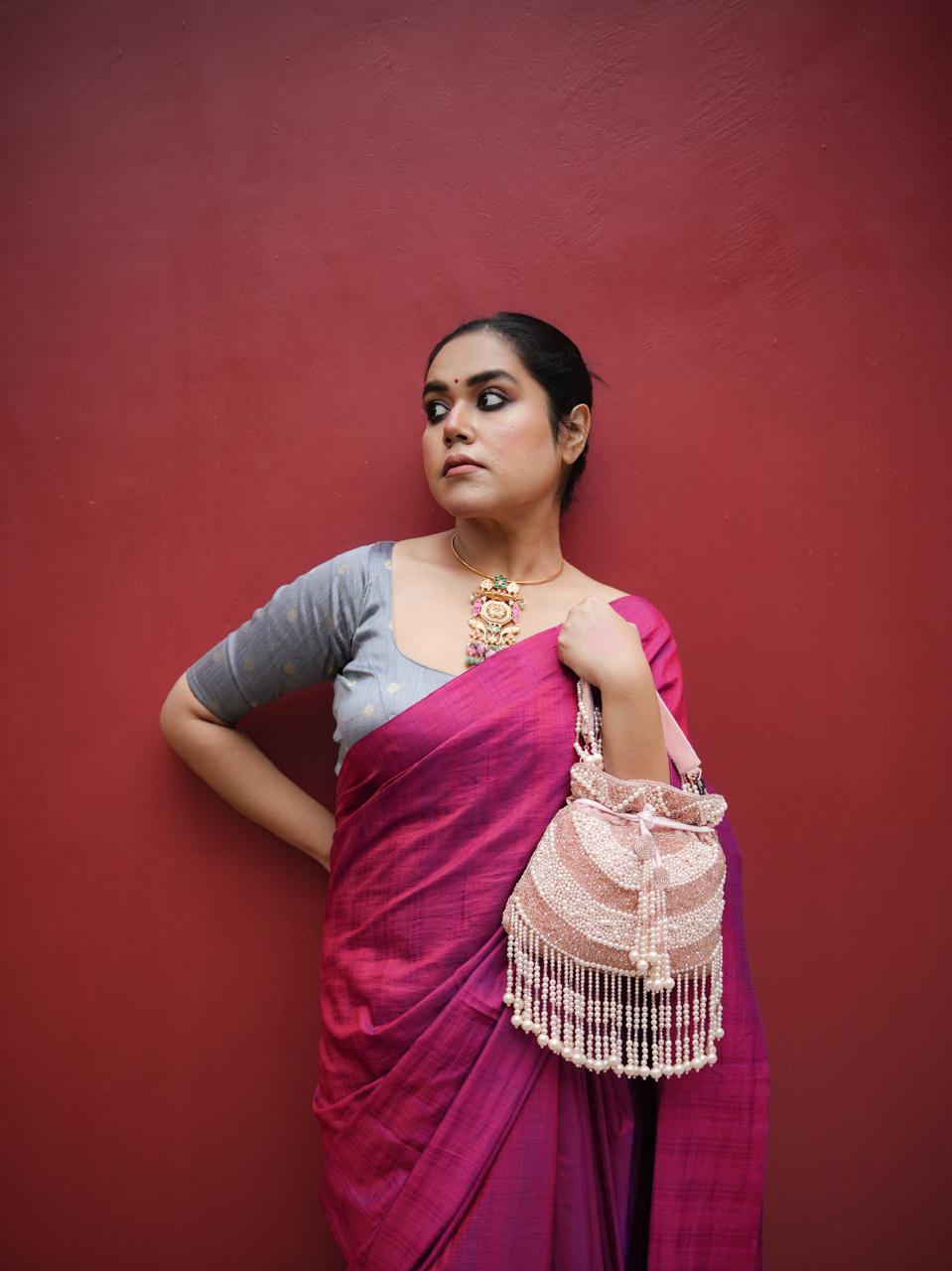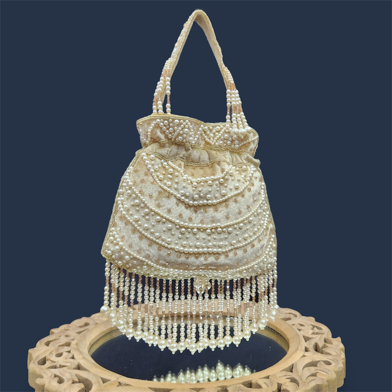 Elevate your style with Moti Leher, an exquisite potli adorned with intricate crystal, seed bead, and pearl embroidery. The luxurious pearl and crystal tassel hangings add a touch of opulence, while the embroidered wrist handle with delicate tassels ensures elegance and functionality. Perfect for weddings, festive occasions, and glamorous soirées!