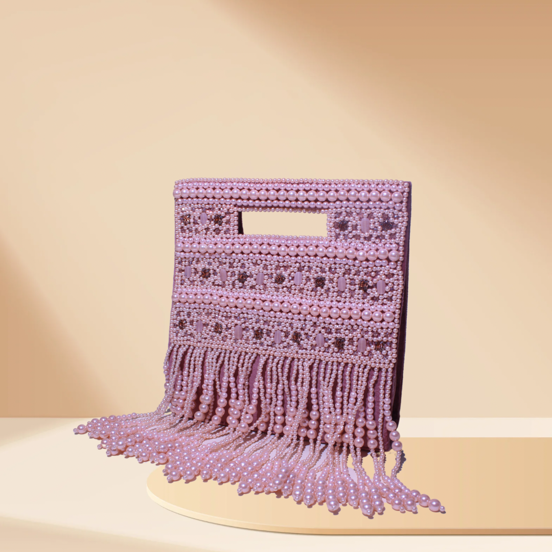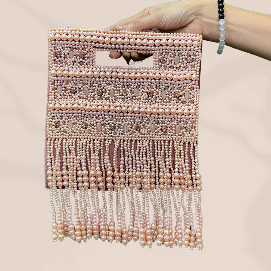 Experience the allure of timeless elegance with the Pearl Enchantment Tassel Bag. This exquisite accessory features intricate pearl embroidery, interspersed with randomly placed crystals. Flat Oval beads & Diamonds are strategically placed between the pearls, adding a touch of sparkle and luxury. The bag is adorned with long pearl tassel hangings that sway gracefully with your every move, making it a perfect statement piece for any special occasion.