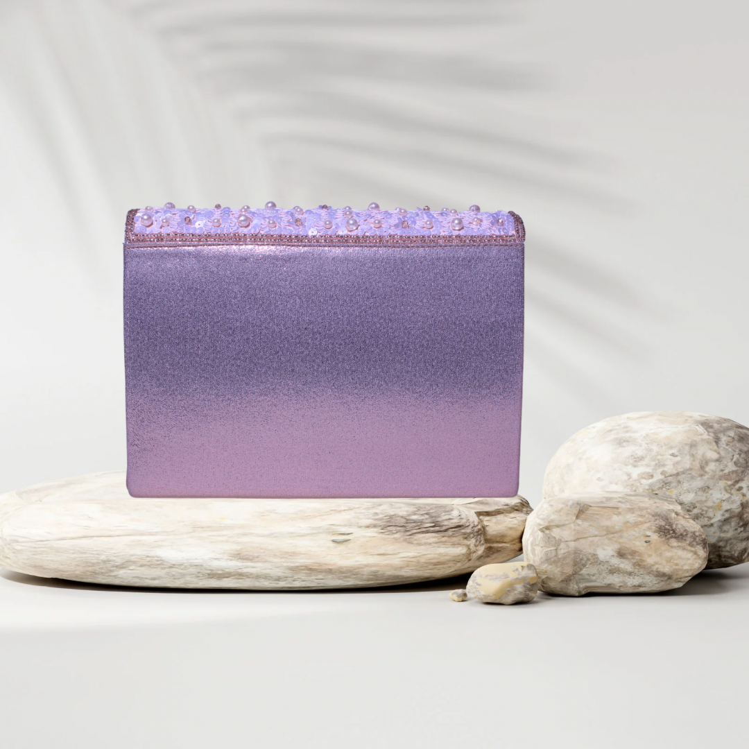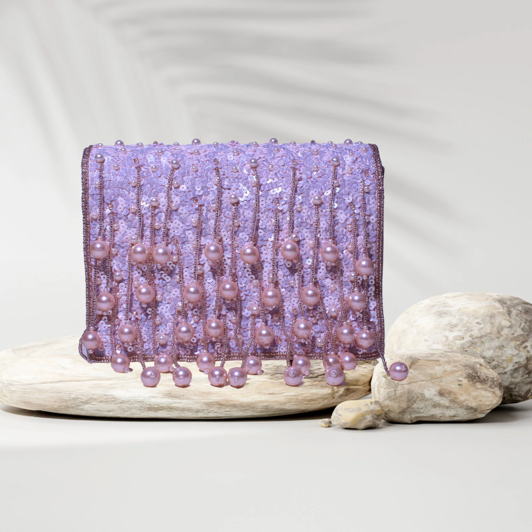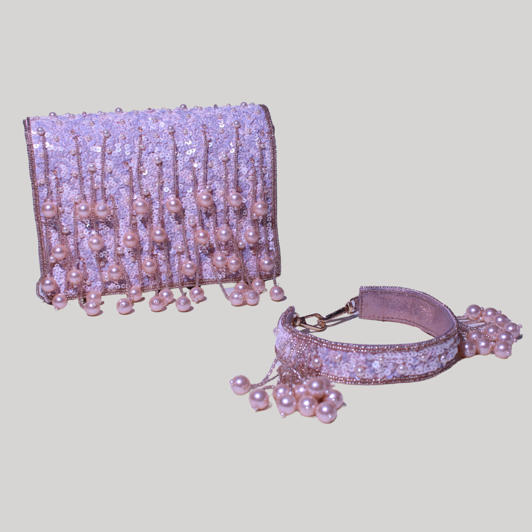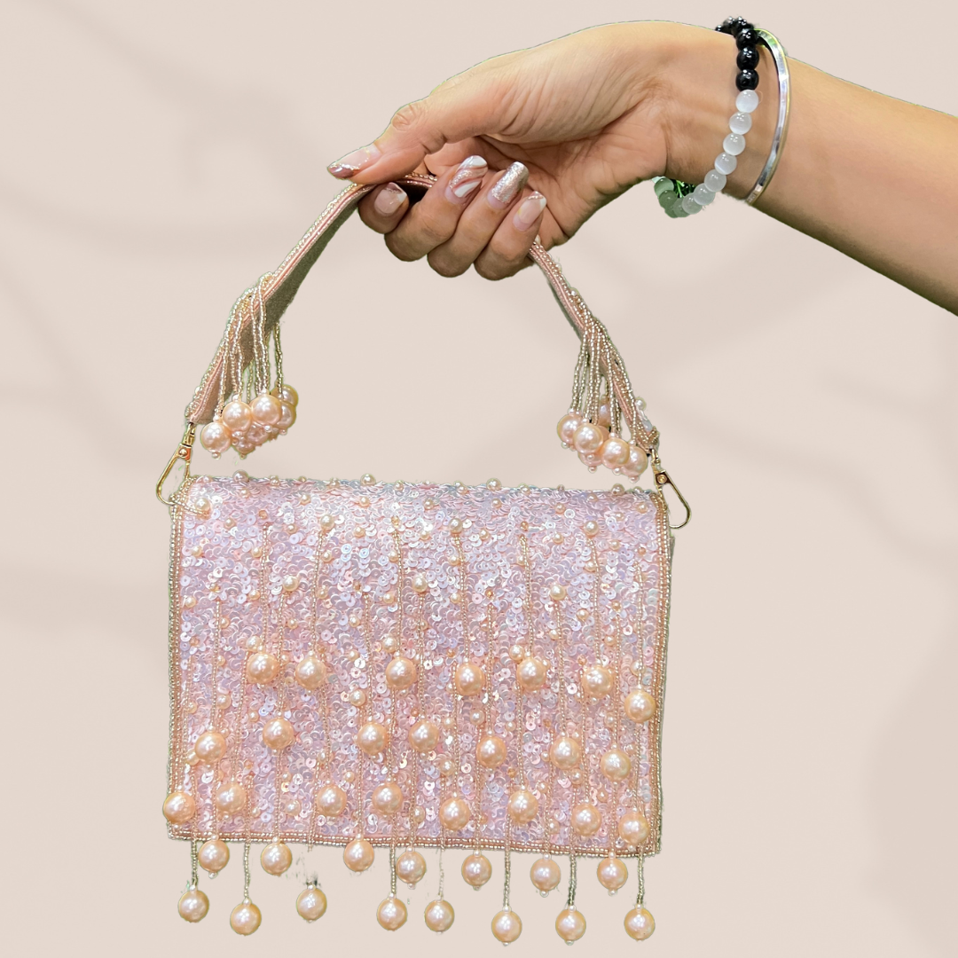 Embrace luxury with the Pearl Radiance Flap Box Bag. Lavishly covered with sequin hand embroidery, this bag also features scattered crystals and pearls for an added sparkle. The flap showcases elegant seed bead hangings, each adorned with a pearl. The handle is designed with a similar pattern and completed with a bunch of beautiful tassel hangings, making it a dazzling accessory for any evening event or celebration.