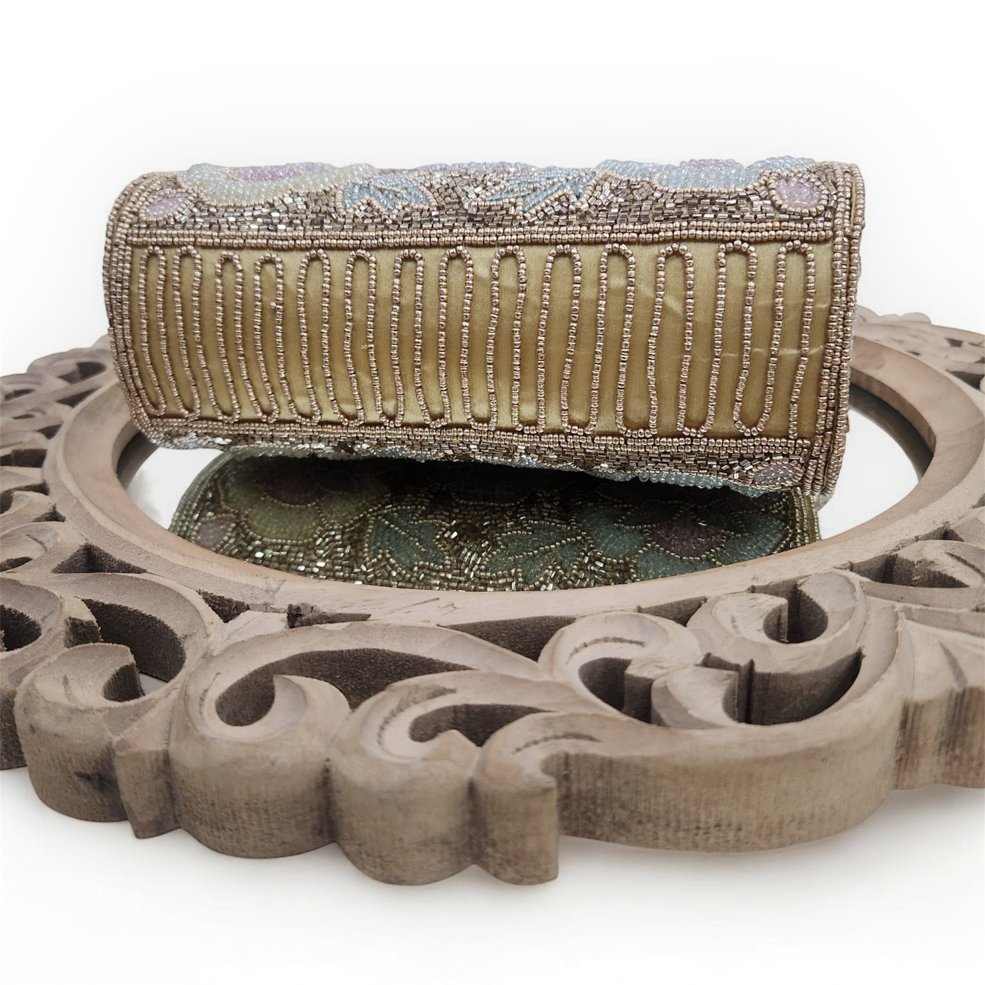 A vibrant fusion of artistry and elegance, PHOOLKARI duffle-shaped bag features exquisite floral embroidery crafted with colorful seed beads, while the rest of the surface shimmers with intricate kardana work. Designed for both style and convenience, it comes with a secure zipper closure, an inside zip pocket and an elegantly embroidered wrist handle. A perfect statement accessory for any special occasion!