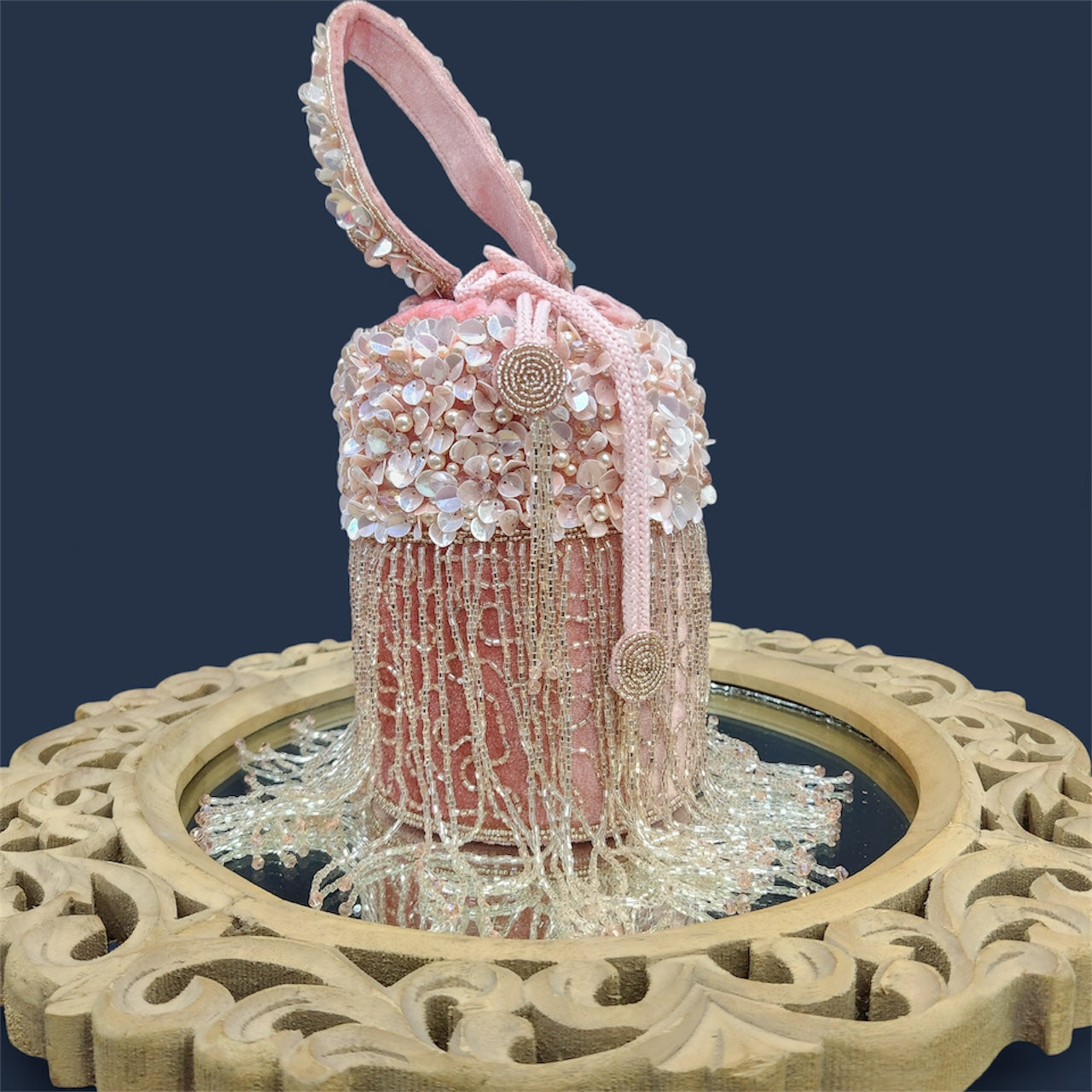 Exude elegance with Pushp Mala, a flat-based potli adorned with shimmering leaf-shaped sequins, pearls, and crystal embroidery. The cascading bugle bead (kardana) tassels add movement and glamour, while the drawstring closure with matching tassels completes the regal look. Perfect for festive, bridal, and evening ensembles!