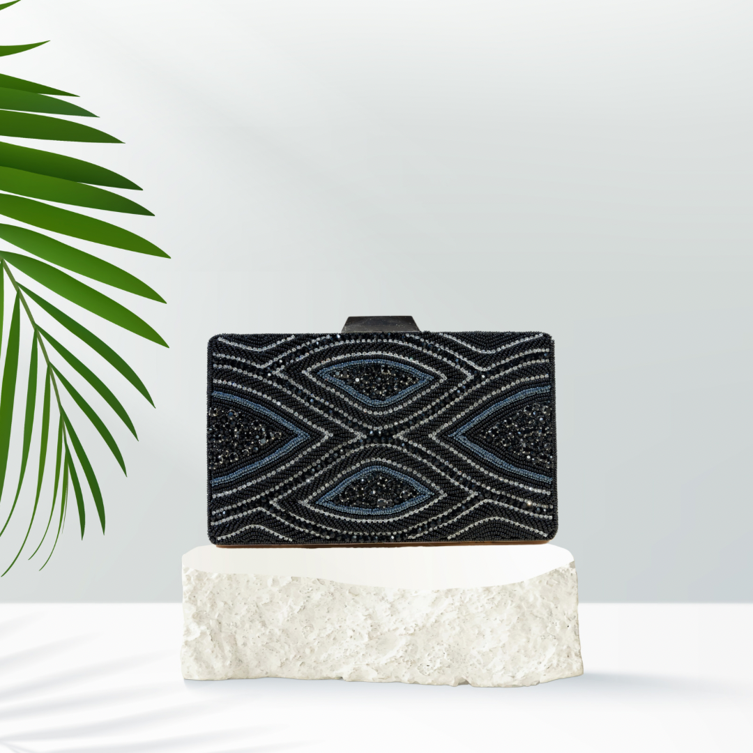 "Lose yourself in a reverie of radiance with our Radiant Reverie Beaded Box Clutch. Each bead, rhinestone, and stitch is a testament to the artistry of our craftsmen, creating a dazzling display of beauty and opulence. This clutch, with its intricate hand embroidery and shimmering embellishments, stands as a beacon of style in a world of ordinary accessories. Make a statement that sparkles and shines with every step you take.