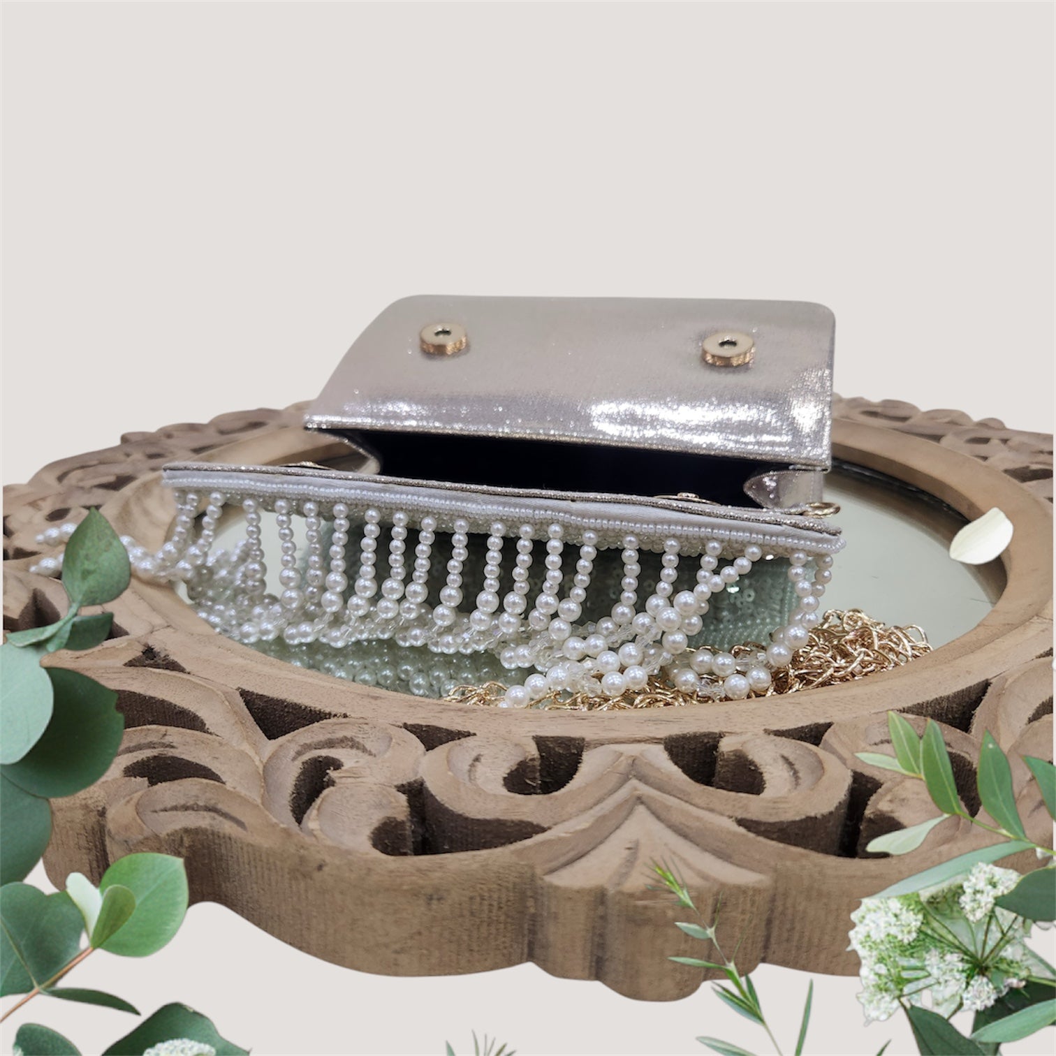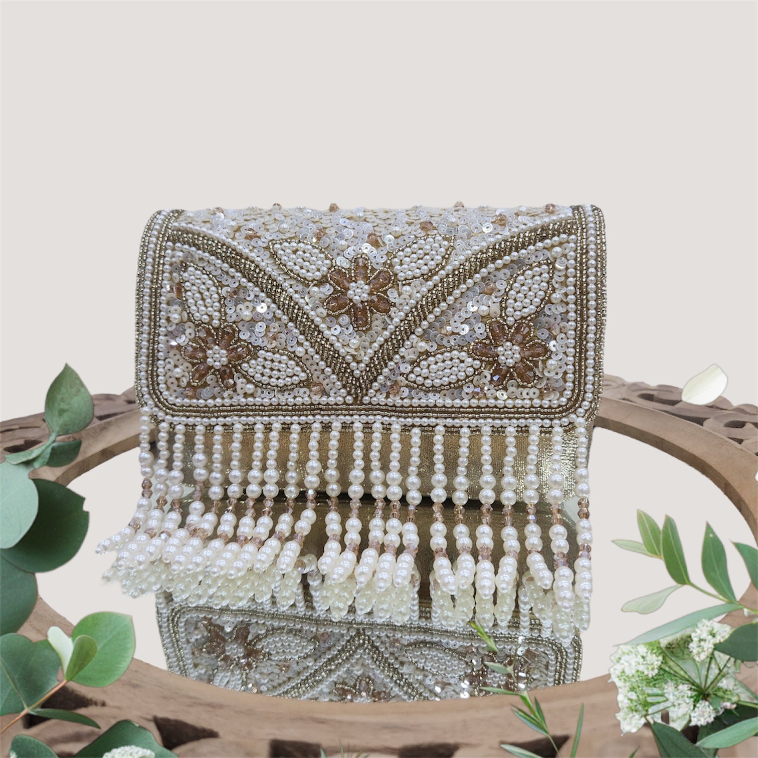 Add a touch of elegance with Gulbahaar Flapover Clutch, featuring shiny sequins, pearl, and crystal hand embroidery in delicate flower and leaf motifs. The flap is adorned with pearl and crystal tassels, while the embroidered wrist handle with tassels on both ends adds a graceful finish. Perfect for weddings and festive soirées!