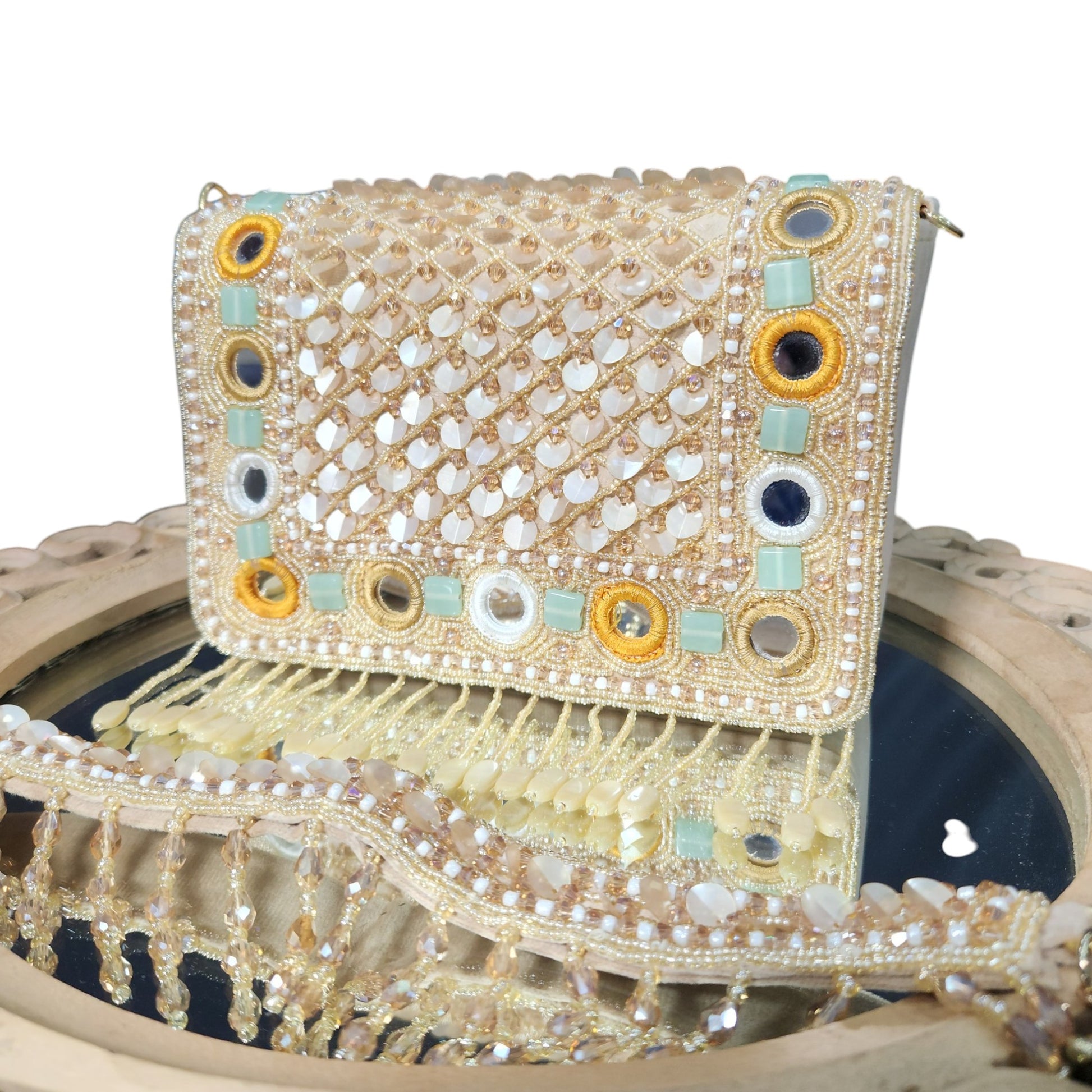 "Step into elegance with this stunning flapover box bag, a perfect blend of traditional artistry and contemporary charm. The flap features intricate checkered seed bead embroidery, with each check sparkling with mirror sequins. The three edges of the flap are adorned with mirrors, each bordered in alternating white and yellow thread, complemented by pastel green stone embroidery. The empty spaces are gracefully filled with shimmering seed beads, adding depth and texture.