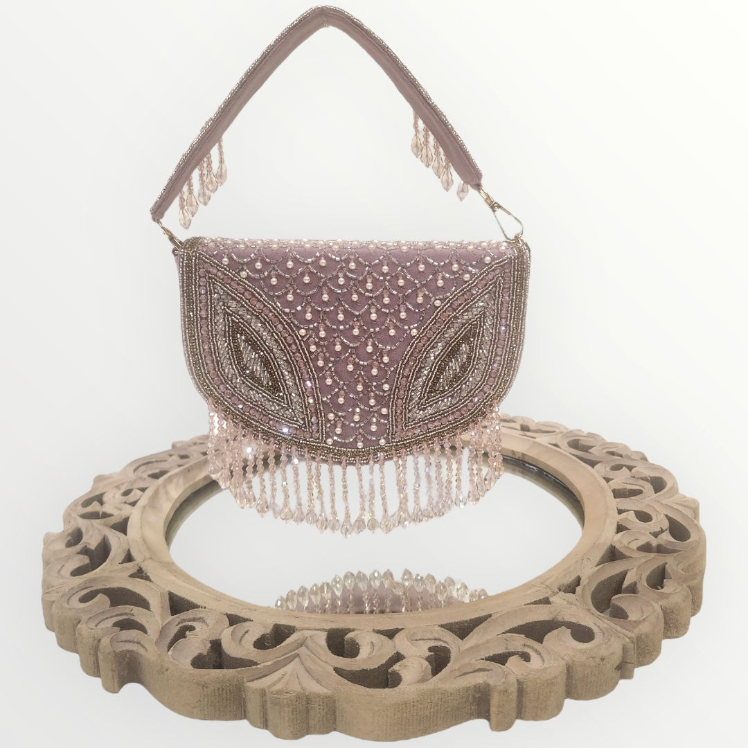 Turn heads with this elegant semicircle flap-over box bag, intricately hand-embroidered with kardana, crystals, and seed beads. The flap features cascading crystal tassels that add a graceful sparkle, while the hand-embroidered wrist handle is finished with crystal tassels on both ends for added charm. Designed for versatility, it also comes with a sleek sling chain for hands-free styling. A perfect blend of structure and shimmer, this bag is ideal for weddings, festive occasions, and evening soirées.