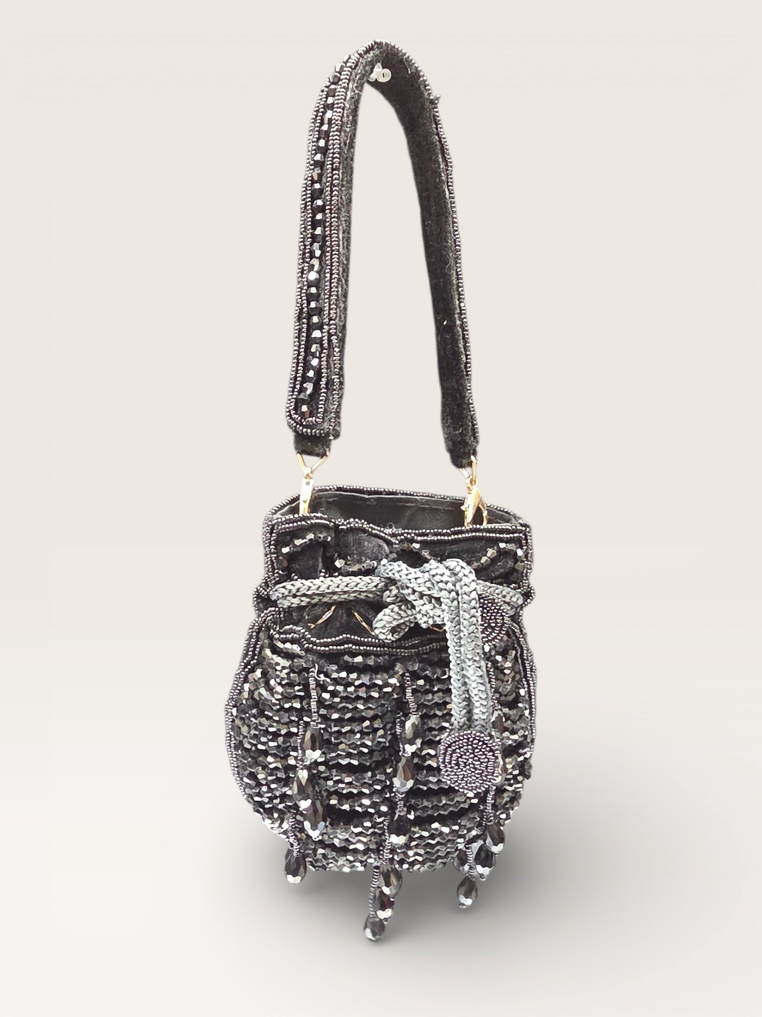Rhimzim Crystal Mini potli is Cute Dainty, dazzling, and designed for the spotlight, this hand-embroidered crystal mini potli is the ultimate evening companion. Adorned with premium crystal hangings that create a rhythmic shimmer, it features a fully embroidered handle for a seamless, luxury finish.