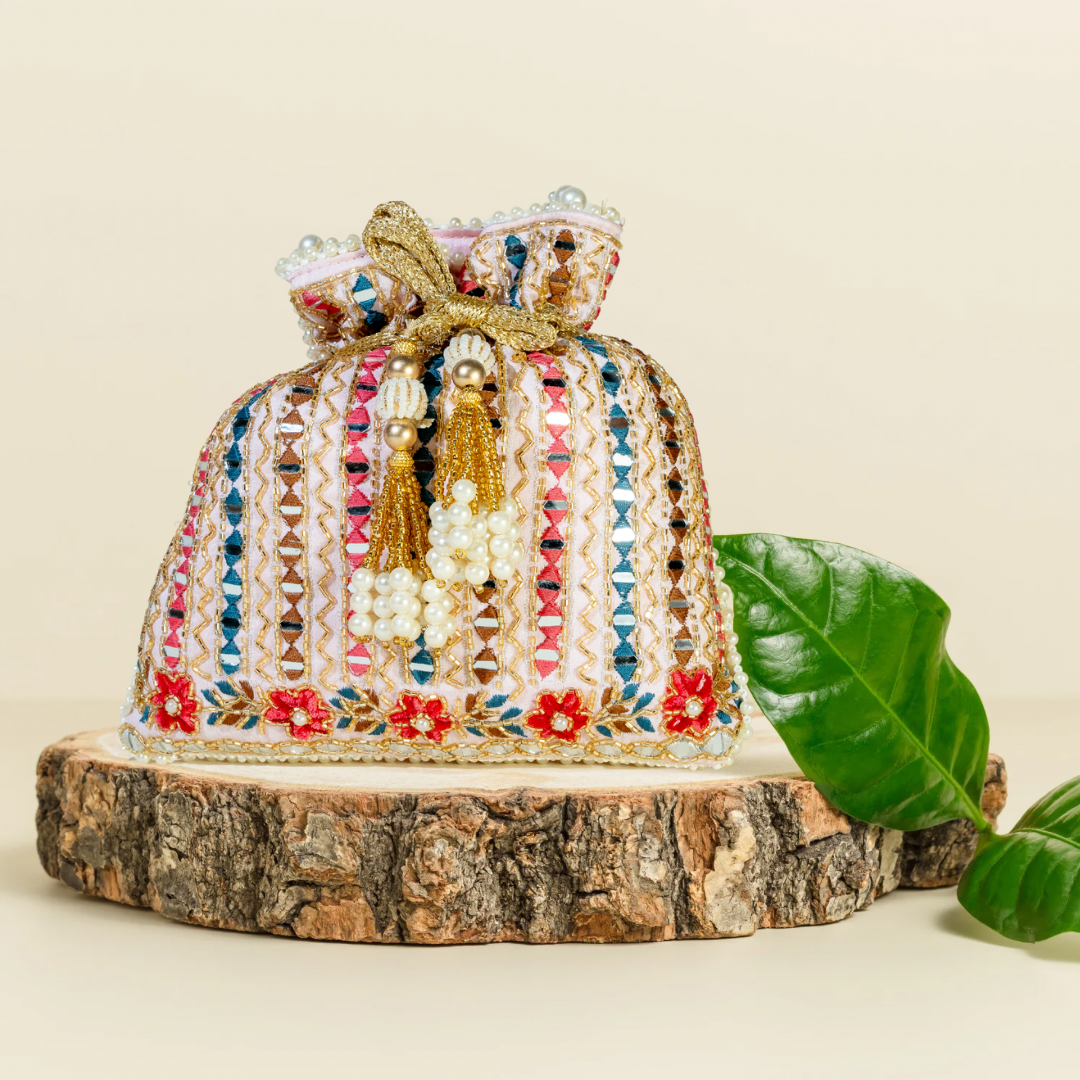Introducing our exquisite Royal Glam Mirror Potli, a true embodiment of traditional craftsmanship and contemporary elegance. This beautiful bag showcases a mesmerizing design with intricate vertical lines of shimmering mirrors, interspersed with alternating lines of Pink, Blue, and Brown Resham work. Adding to its charm, the bag features zigzag bugle bead lines, which shimmer and shine with every movement, adding a touch of glamour and sophistication. The horizontal flow of flowers and leaves Resham embroidery on the bottom border further enhances its beauty, creating a harmonious blend of colours and patterns. Crafted from high-quality raw silk, this potli bag offers a luxurious feel and a soft, plush texture that is a delight to touch. The drawstring closure with beautiful beaded tassels not only adds to the glory but also ensures your belongings are secure, while the spacious interior provides ample space for your essentials, making it perfect for special occasions, weddings, or festive celebrations. The classy golden bead & pearl handle adds to the charm. Carry this stunning potli bag to elevate any outfit and make a statement wherever you go. Whether you're attending a wedding, a traditional ceremony, or a cultural event, this Raw Silk Potli Bag is sure to be a conversation starter and a cherished addition to your accessory collection.