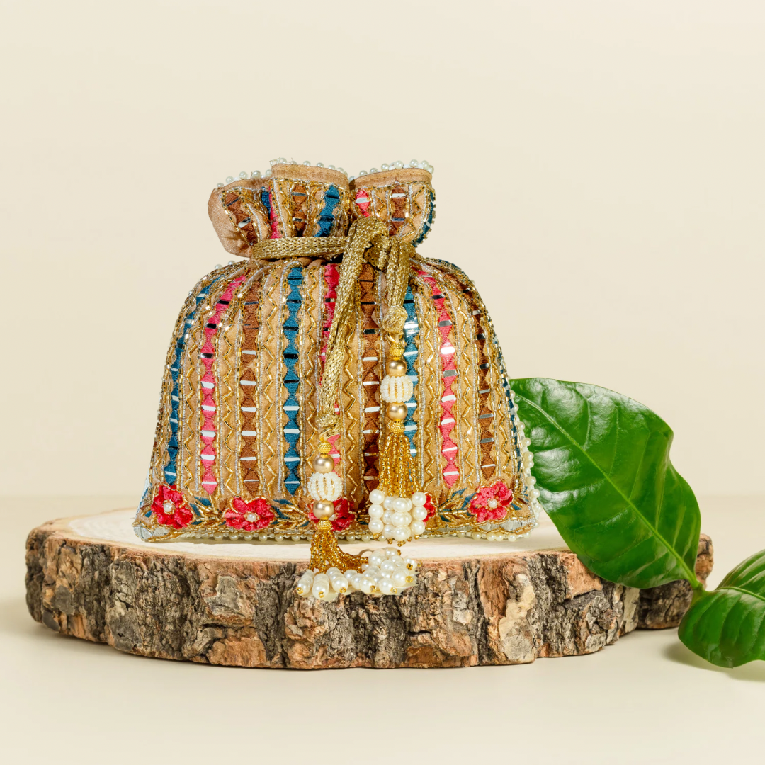 Introducing our exquisite Royal Glam Mirror Potli, a true embodiment of traditional craftsmanship and contemporary elegance. This beautiful bag showcases a mesmerizing design with intricate vertical lines of shimmering mirrors, interspersed with alternating lines of Pink, Blue, and Brown Resham work. Adding to its charm, the bag features zigzag bugle bead lines, which shimmer and shine with every movement, adding a touch of glamour and sophistication. The horizontal flow of flowers and leaves Resham embroidery on the bottom border further enhances its beauty, creating a harmonious blend of colours and patterns. Crafted from high-quality raw silk, this potli bag offers a luxurious feel and a soft, plush texture that is a delight to touch. The drawstring closure with beautiful beaded tassels not only adds to the glory but also ensures your belongings are secure, while the spacious interior provides ample space for your essentials, making it perfect for special occasions, weddings, or festive celebrations. The classy golden bead & pearl handle adds to the charm. Carry this stunning potli bag to elevate any outfit and make a statement wherever you go. Whether you're attending a wedding, a traditional ceremony, or a cultural event, this Raw Silk Potli Bag is sure to be a conversation starter and a cherished addition to your accessory collection.