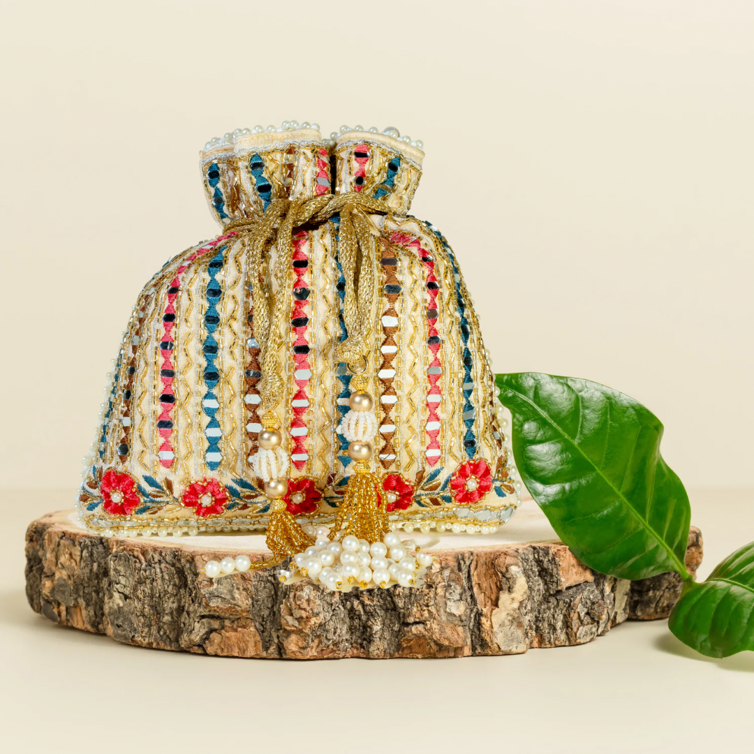 Introducing our exquisite Royal Glam Mirror Potli, a true embodiment of traditional craftsmanship and contemporary elegance. This beautiful bag showcases a mesmerizing design with intricate vertical lines of shimmering mirrors, interspersed with alternating lines of Pink, Blue, and Brown Resham work. Adding to its charm, the bag features zigzag bugle bead lines, which shimmer and shine with every movement, adding a touch of glamour and sophistication. The horizontal flow of flowers and leaves Resham embroidery on the bottom border further enhances its beauty, creating a harmonious blend of colours and patterns. Crafted from high-quality raw silk, this potli bag offers a luxurious feel and a soft, plush texture that is a delight to touch. The drawstring closure with beautiful beaded tassels not only adds to the glory but also ensures your belongings are secure, while the spacious interior provides ample space for your essentials, making it perfect for special occasions, weddings, or festive celebrations. The classy golden bead & pearl handle adds to the charm. Carry this stunning potli bag to elevate any outfit and make a statement wherever you go. Whether you're attending a wedding, a traditional ceremony, or a cultural event, this Raw Silk Potli Bag is sure to be a conversation starter and a cherished addition to your accessory collection.