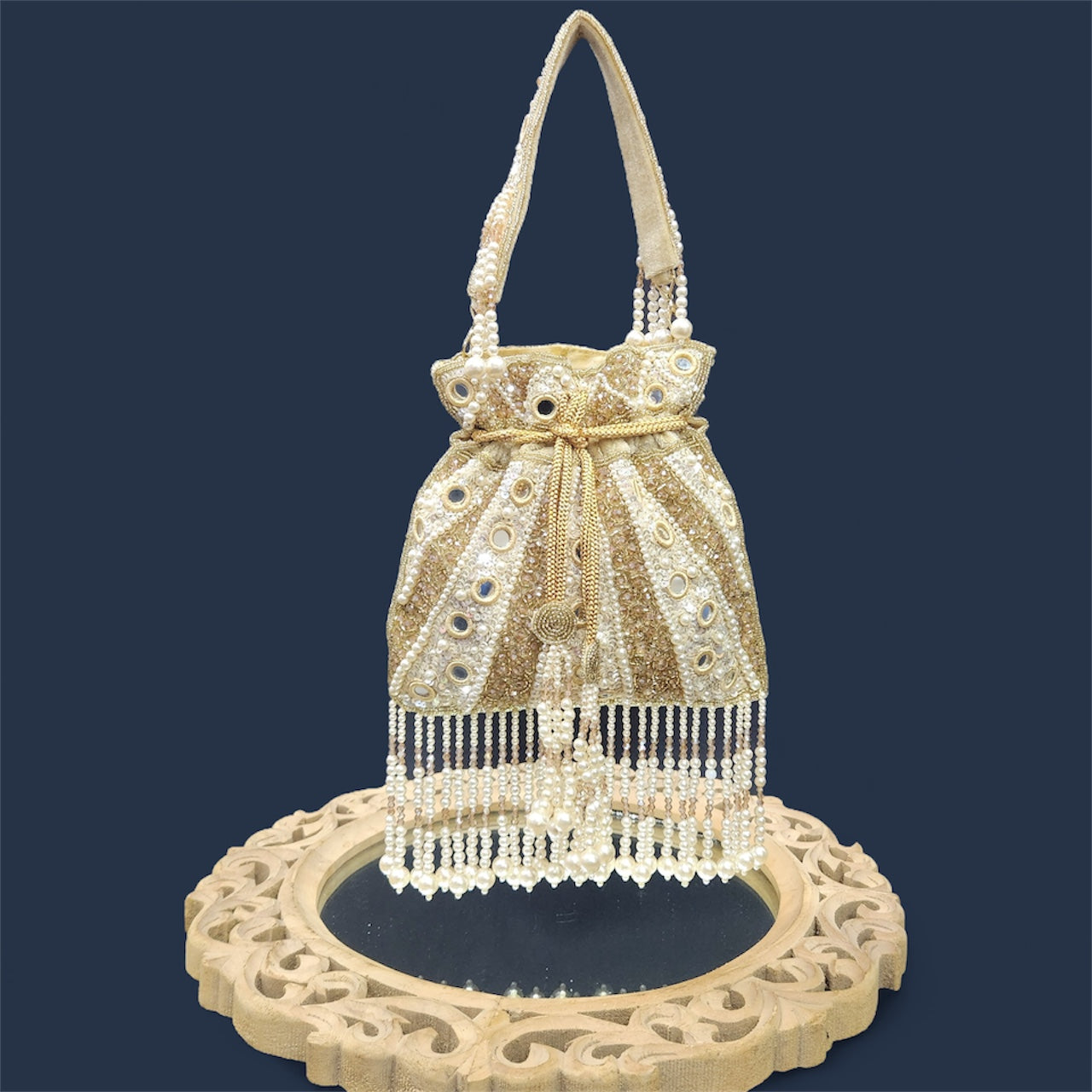 "Step into elegance with this enchanting potli bag, adorned with intricate mirror, crystal, sequin, and pearl embroidery. The luxurious design is elevated by dazzling pearl and crystal tassel hangings at the bottom, adding a touch of glamour. Featuring a beautifully embroidered wrist handle with delicate tassels, this potli is the perfect accessory to complement your festive and bridal ensembles. A stunning blend of tradition and sophistication, it’s an absolute must-have for weddings and special occasions."