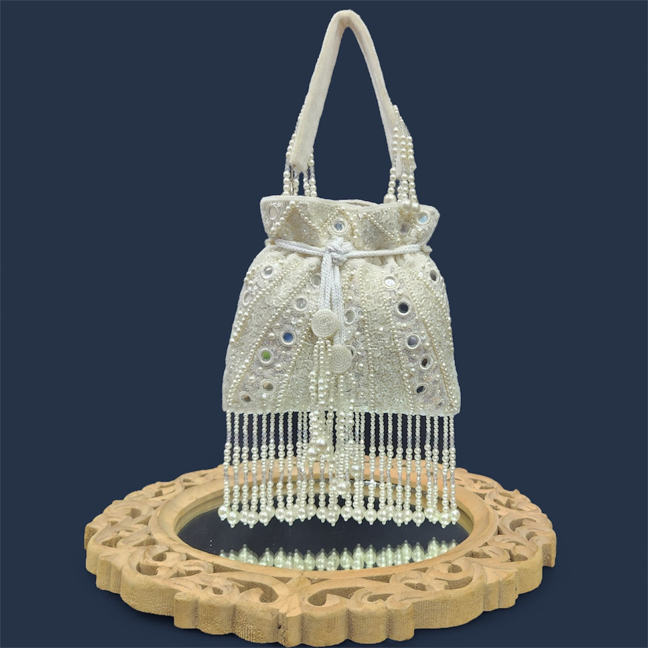 "Step into elegance with this enchanting potli bag, adorned with intricate mirror, crystal, sequin, and pearl embroidery. The luxurious design is elevated by dazzling pearl and crystal tassel hangings at the bottom, adding a touch of glamour. Featuring a beautifully embroidered wrist handle with delicate tassels, this potli is the perfect accessory to complement your festive and bridal ensembles. A stunning blend of tradition and sophistication, it’s an absolute must-have for weddings and special occasions."