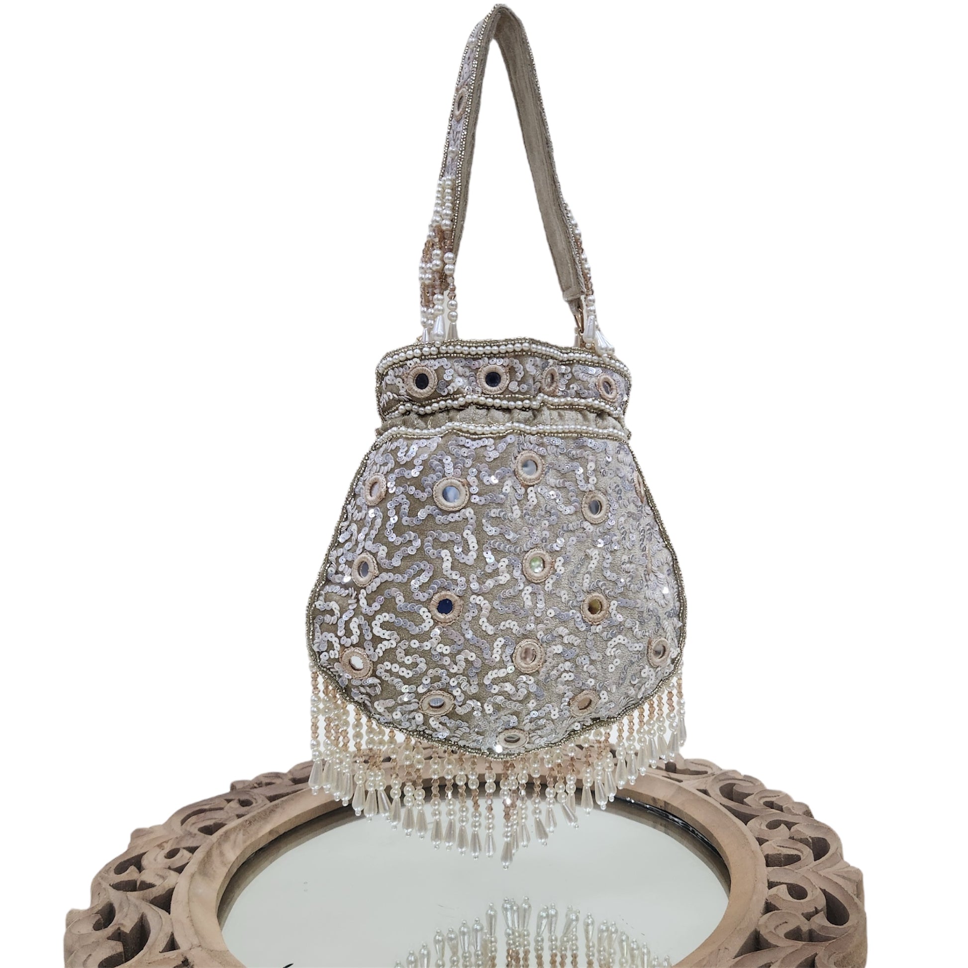 Add a touch of sparkle with Sitara Mirror Potli, adorned with dazzling mirror and sequin work. The elegant long pearl tassels and embroidered wrist handle elevate its charm, while the drawstring closure ensures both style and convenience. Perfect for weddings and festive celebrations!