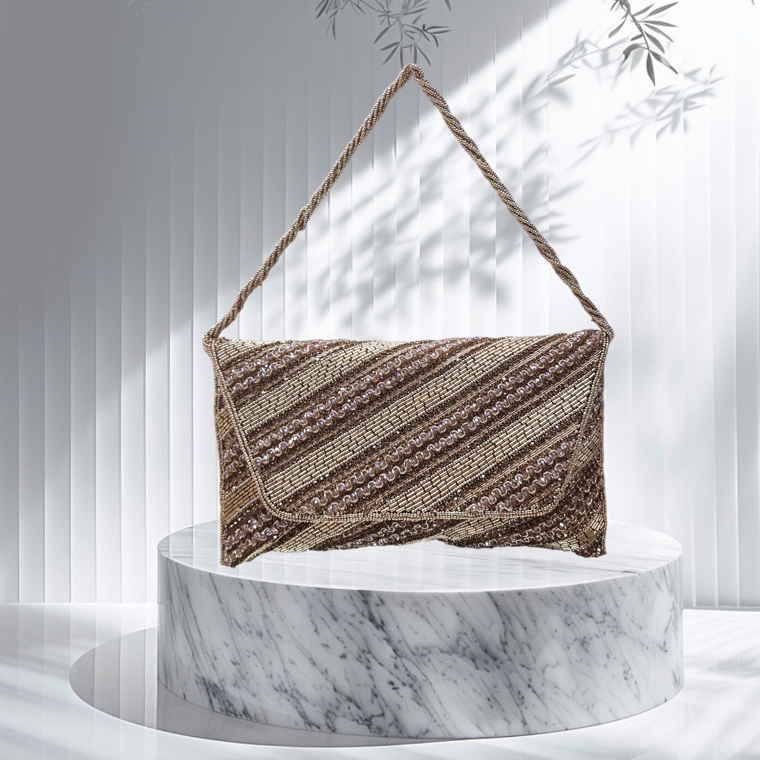 Make every celebration unforgettable with Swarnarekha, a breathtaking hand-embroidered flap clutch featuring diagonal rows of shimmering diamonds, seed beads, kardana, and crystal beads. The spaces between are filled with intricate jardozi work, adding richness and depth to the design. Its sleek envelope silhouette, delicately beaded handle, and fine craftsmanship make it the perfect statement accessory for weddings, festive occasions, and elegant evening gatherings. Available in a range of timeless and trendy colors to suit every outfit and mood.