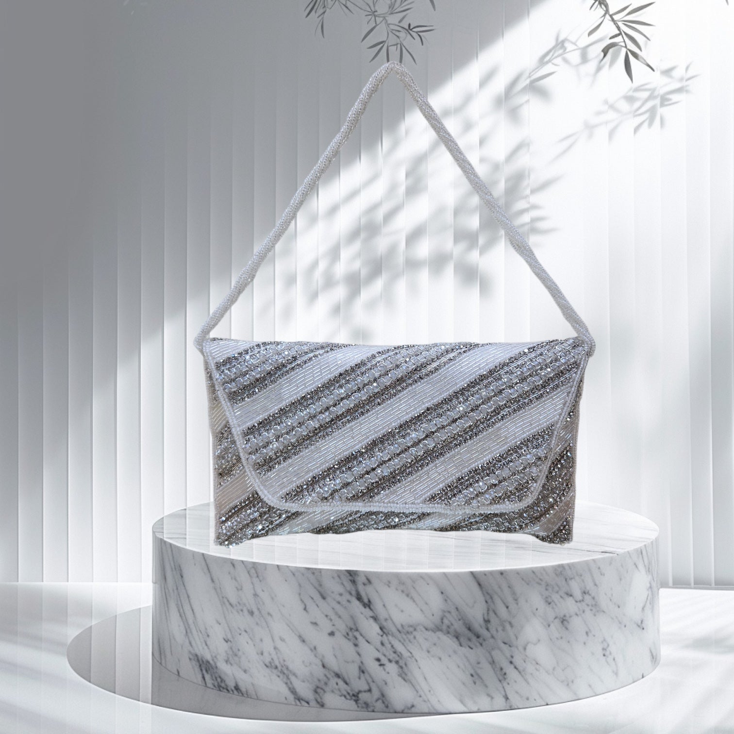 Make every celebration unforgettable with Swarnarekha, a breathtaking hand-embroidered flap clutch featuring diagonal rows of shimmering diamonds, seed beads, kardana, and crystal beads. The spaces between are filled with intricate jardozi work, adding richness and depth to the design. Its sleek envelope silhouette, delicately beaded handle, and fine craftsmanship make it the perfect statement accessory for weddings, festive occasions, and elegant evening gatherings. Available in a range of timeless and trendy colors to suit every outfit and mood.