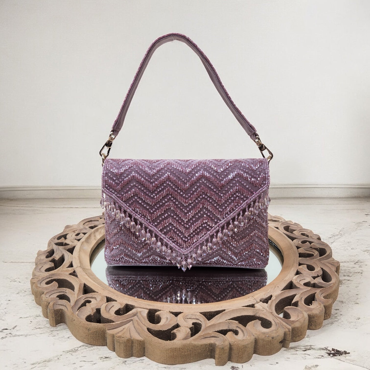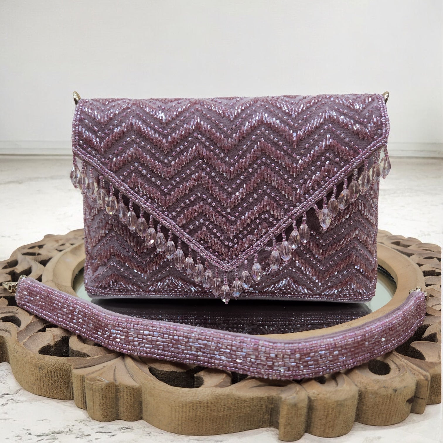 Hand-embroidered with shimmering kardana beads in intricate chevron patterns, this elegant clutch brings a perfect blend of traditional craftsmanship and modern sophistication.