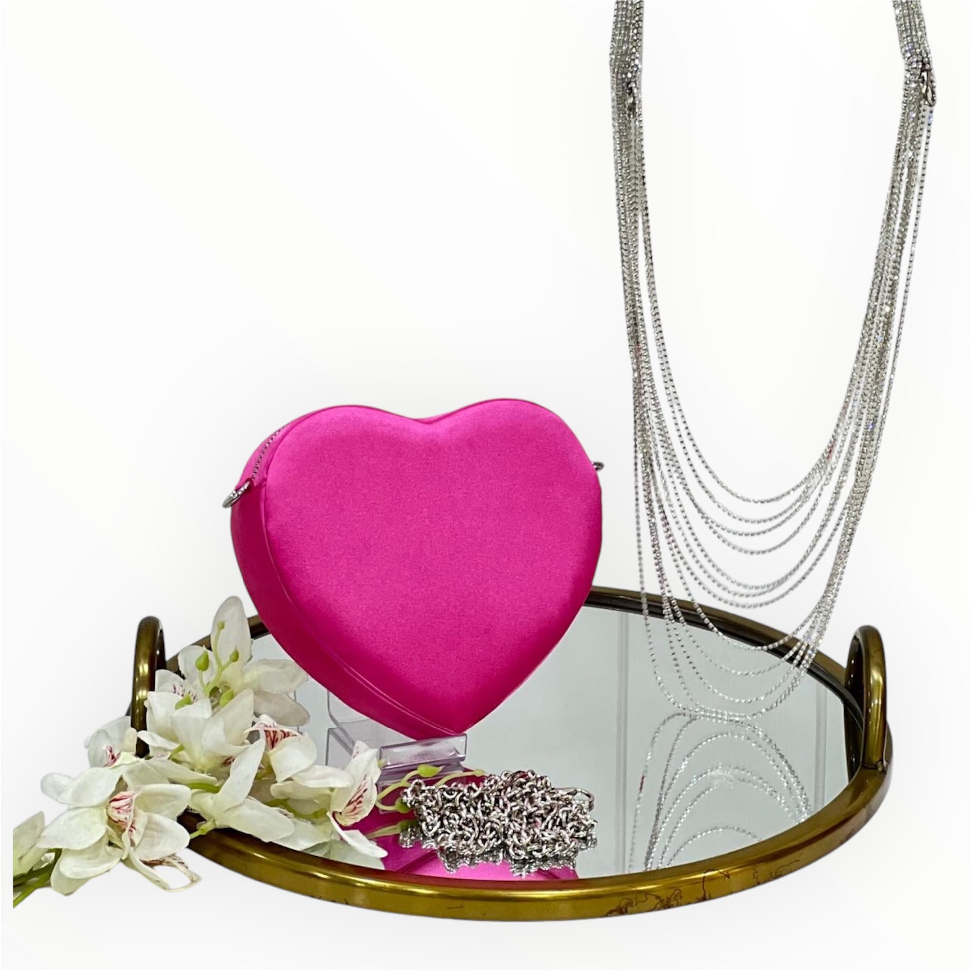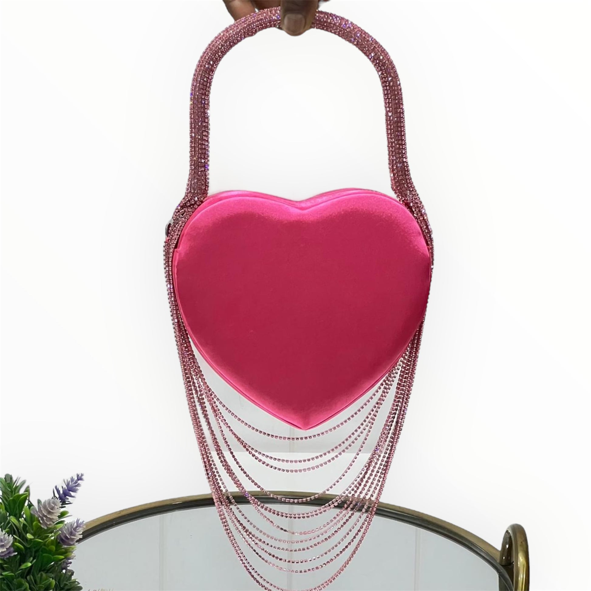 This satin heart bag is the epitome of elegance and charm, designed to make a statement at any party. Featuring a dazzling diamond dangler handle and a sleek sling chain, this bag effortlessly blends luxury and functionality. Its unique heart shape and lustrous satin finish add a touch of romance and sophistication, making it the classiest party accessory. Perfect for elevating your evening attire, this bag is a must-have for anyone looking to enhance their style with a glamorous touch.