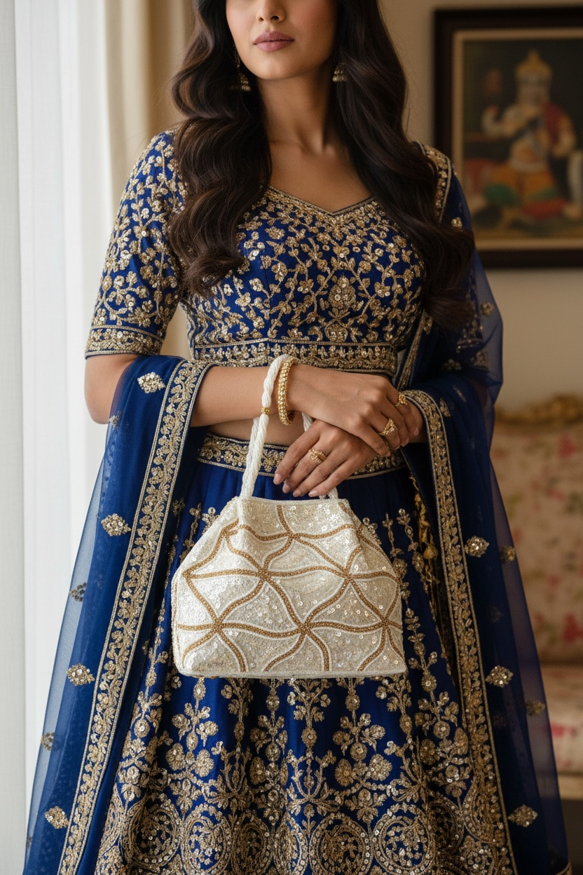• Artisanal Craftsmanship: The front showcases a mesmerizing geometric layout of sequins and diamonds, while the back is fully encrusted with premium seed beads for a textured, luxury finish.