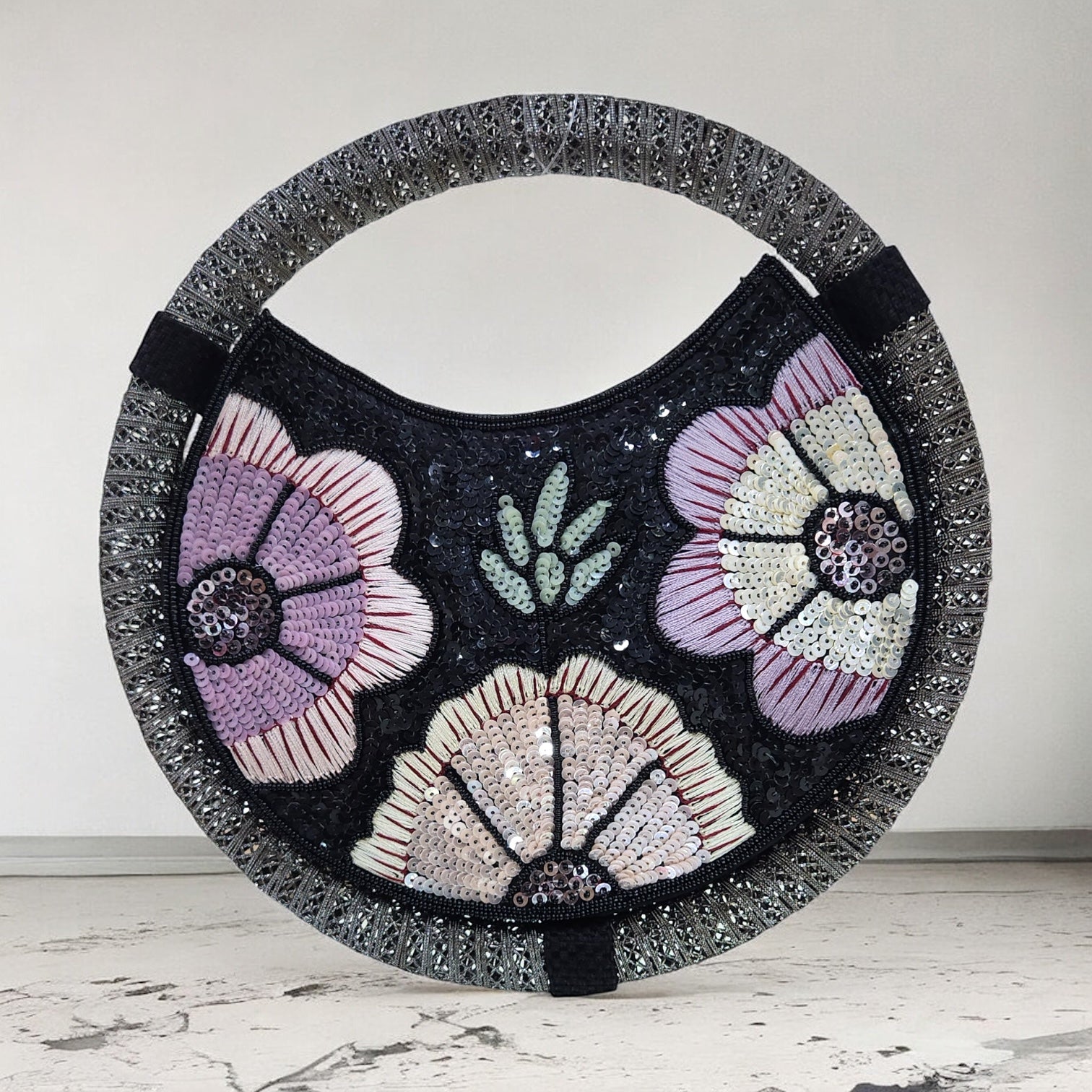 Celebrate the spirit of tradition with Varnika, a handcrafted ring handle bag that beautifully blends artistry and elegance. Designed in a unique crescent silhouette, it features intricate hand embroidery with pastel sequins, seed beads, and delicate threadwork, forming blooming floral motifs. The structured ring handle wrapped in zari adds a regal touch, making Varnika the perfect companion for weddings, festive occasions, and evening soirées.