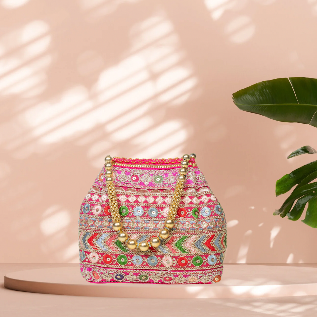 Elevate your style with our Vibrant Geometric Raw Silk Potli. This exquisite bag is crafted from premium raw silk and features intricate geometric Resham work in a spectrum of colorful hues. The geometric patterns create a mesmerizing mosaic design that adds a contemporary flair to this traditional accessory, making it a perfect statement piece for any occasion. It comes with 3 magents for closure & a beautiful golden handle, while the spacious interior provides ample space for your essentials, making it perfect for special occasions, weddings, or festive celebrations