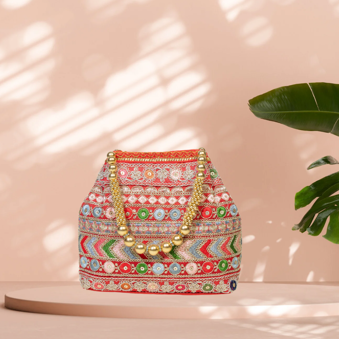 Elevate your style with our Vibrant Geometric Raw Silk Potli. This exquisite bag is crafted from premium raw silk and features intricate geometric Resham work in a spectrum of colorful hues. The geometric patterns create a mesmerizing mosaic design that adds a contemporary flair to this traditional accessory, making it a perfect statement piece for any occasion. It comes with 3 magents for closure & a beautiful golden handle, while the spacious interior provides ample space for your essentials, making it perfect for special occasions, weddings, or festive celebrations