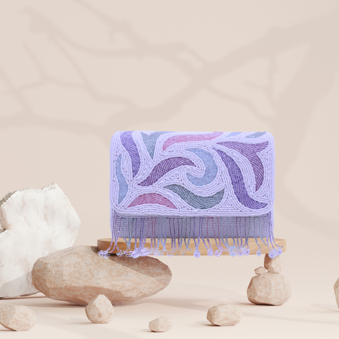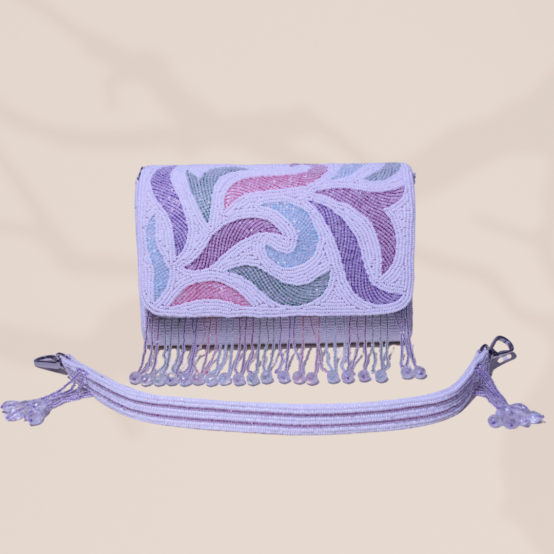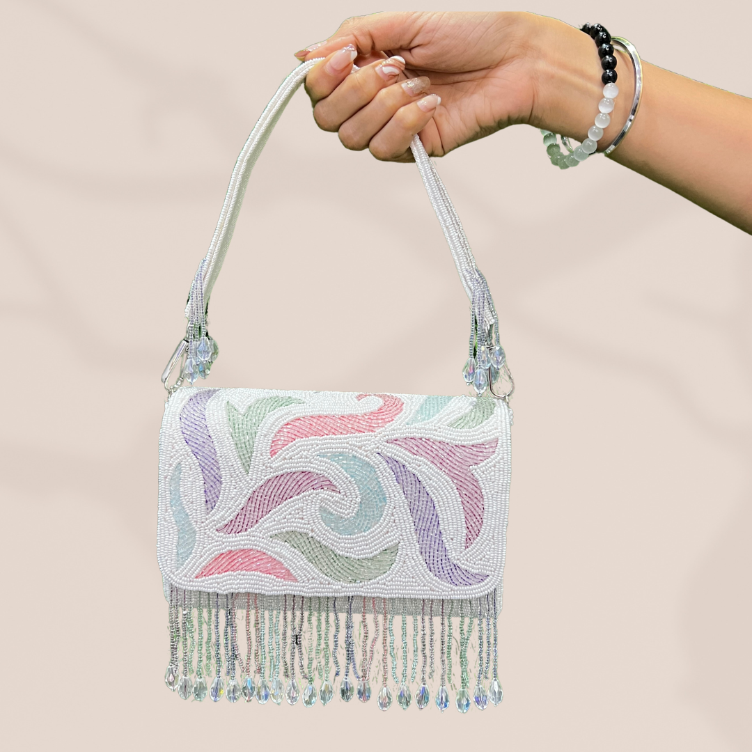 The Vivid Cascade FlapOver Clutch Bag is a true masterpiece of vibrant design and intricate craftsmanship. This flap box bag is entirely covered with seed bead embroidery, featuring a flap adorned with random leaf-type shapes filled with different colors like purple, violet, light blue, green, and pink. Tassel hangings in alternating colors add a dynamic and playful touch to the flap, while the wrist handle, covered in seed bead handwork, features tassel hangings on both ends. ThisFlapOver Clutch Bag is perfect for those who love to make a statement with their accessories, adding a pop of color and sophistication to any outfit.