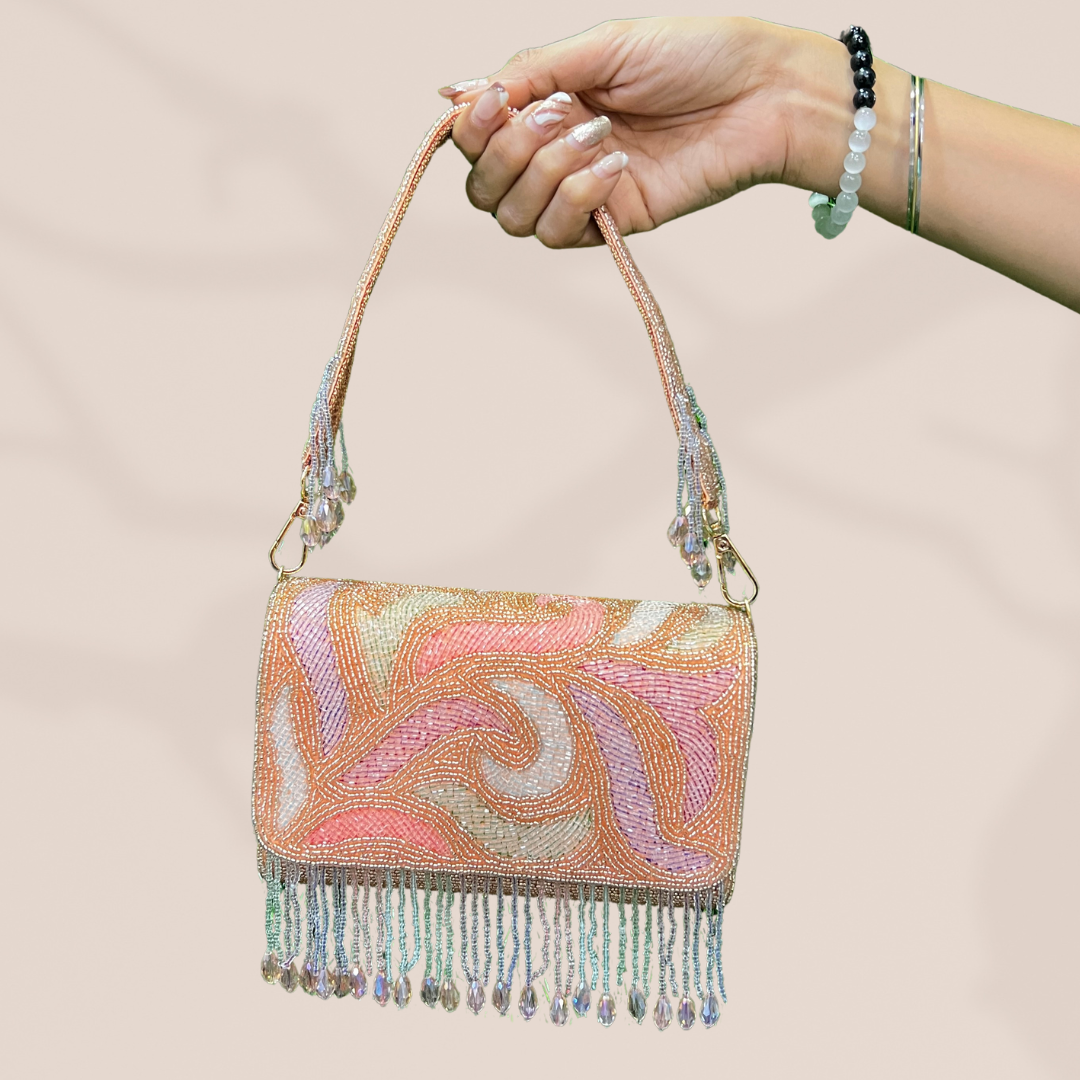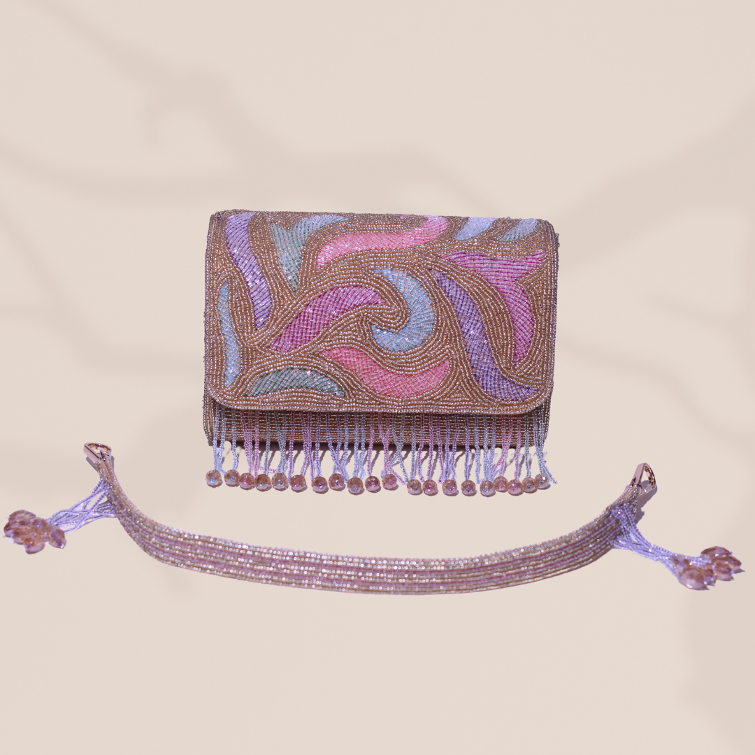 The Vivid Cascade FlapOver Clutch Bag is a true masterpiece of vibrant design and intricate craftsmanship. This flap box bag is entirely covered with seed bead embroidery, featuring a flap adorned with random leaf-type shapes filled with different colors like purple, violet, light blue, green, and pink. Tassel hangings in alternating colors add a dynamic and playful touch to the flap, while the wrist handle, covered in seed bead handwork, features tassel hangings on both ends. This bag is perfect for those who love to make a statement with their accessories, adding a pop of color and sophistication to any outfit.