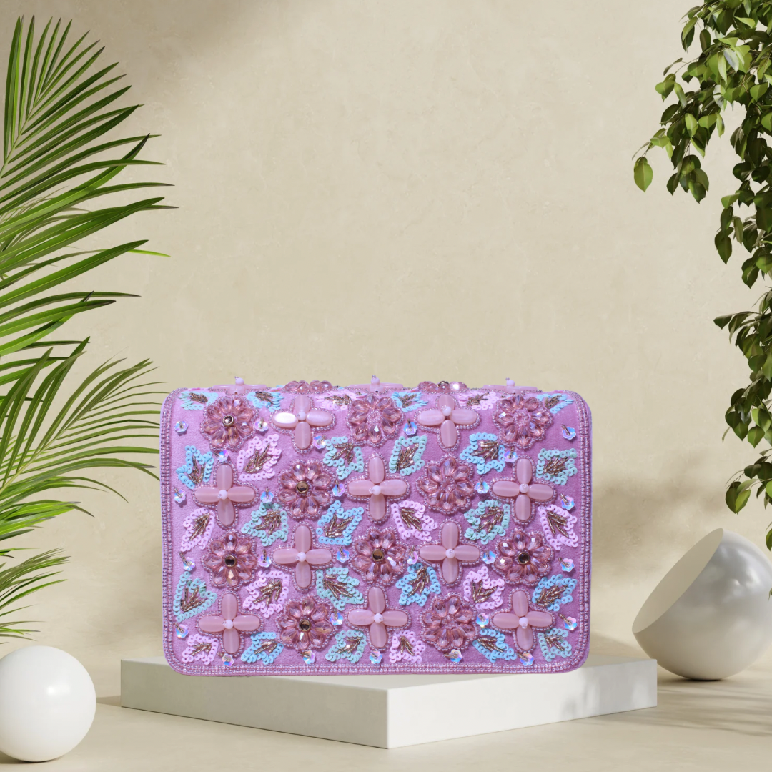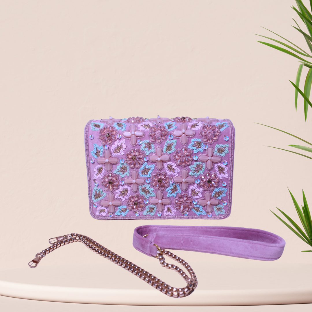 The Whimsical Bloom FlapOver Clutch Bag is a celebration of intricate craftsmanship and floral elegance. Adorned with numerous small bead formations, this bag showcases flat oval beads arranged in flower patterns, each centered with a pony bead and outlined with seed beads. Sequins form graceful leaf motifs all over, while bugle beads and drop-shaped crystal beads add opulent floral details. Randomly placed flower sequins add a touch of whimsy, making this bag a versatile and stylish addition to your wardrobe.