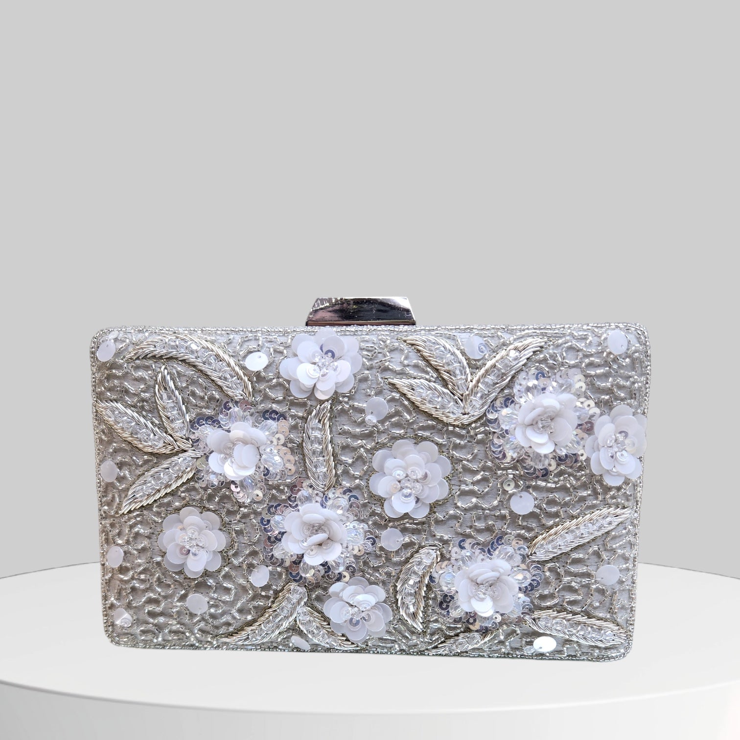 Exquisitely handcrafted, this frame box clutch brings timeless elegance to your festive and wedding looks. Embellished with intricate floral embroidery, sequins, and 3D beadwork, each piece radiates luxury and grace. The metallic leaves and delicate blooms create a stunning texture, making it a true statement accessory.